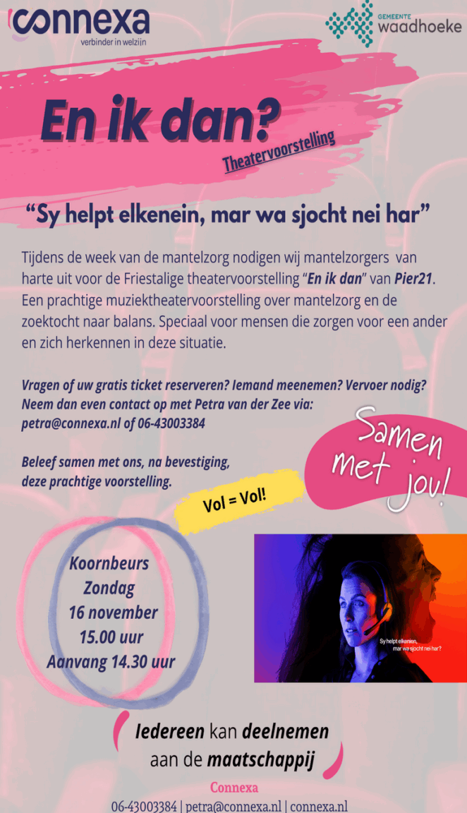 Speciaal voor de mantelzorger: “En ik dan?” Een bijzondere theatervoorstelling speciaal voor u In samenwerking met de gemeente Waadhoeke nodigen wij u tijdens de Week van de Mantelzorg van harte […]