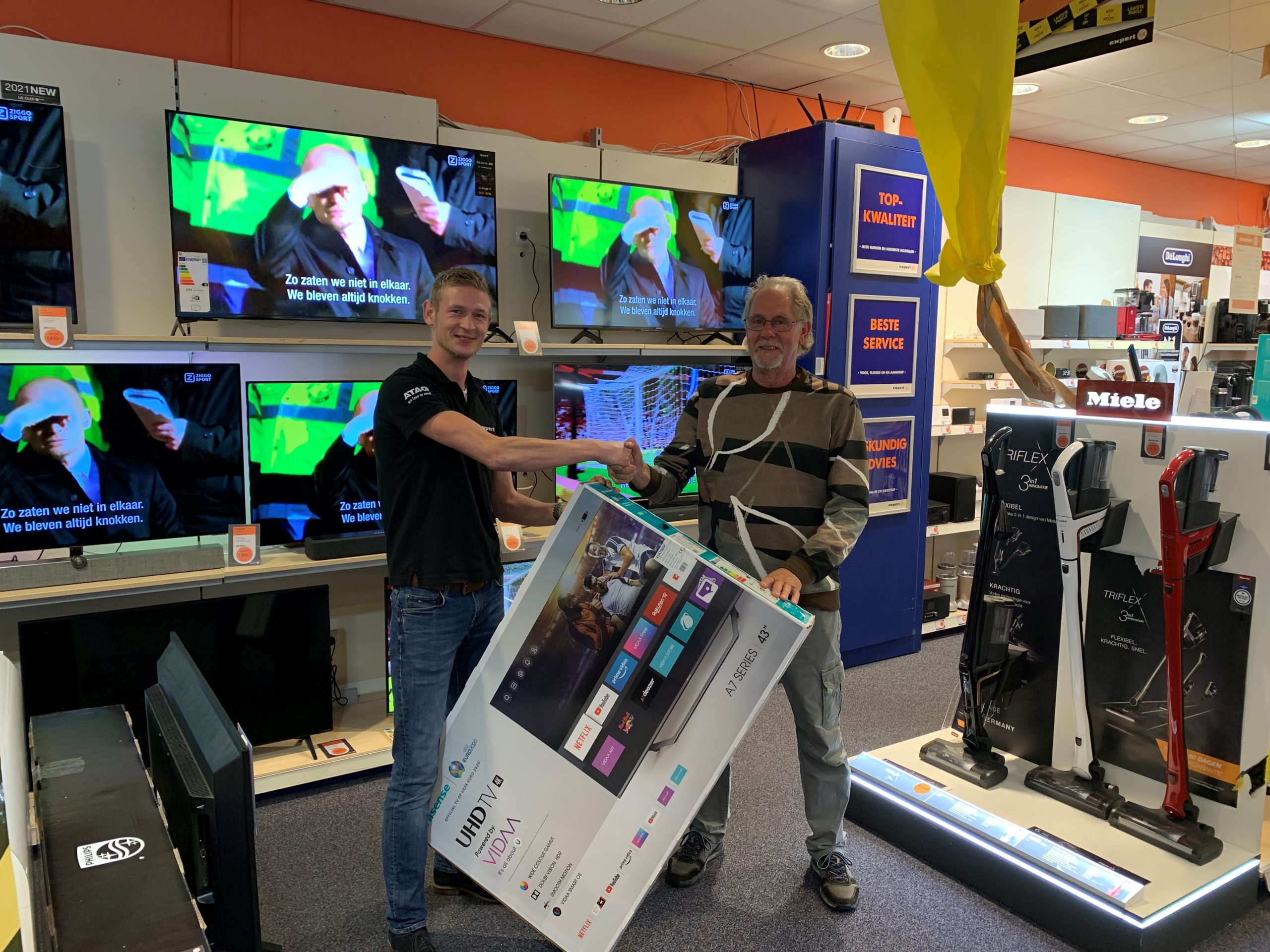 Foto 2: v.l.n.r. Geoffrey Schilte (Expert) en prijswinnaar dhr. Tigchelaar uit Makkum met de HDTV.
