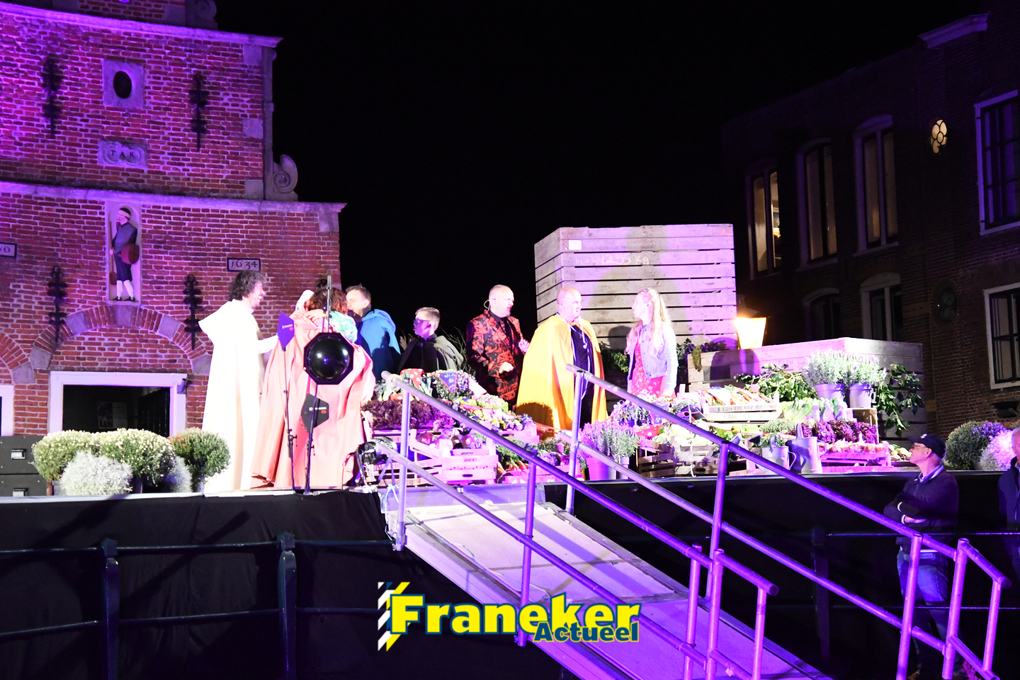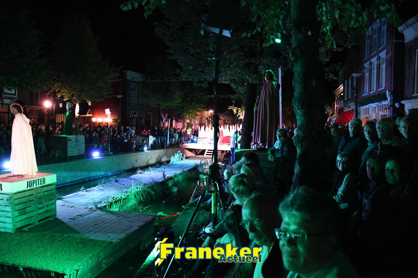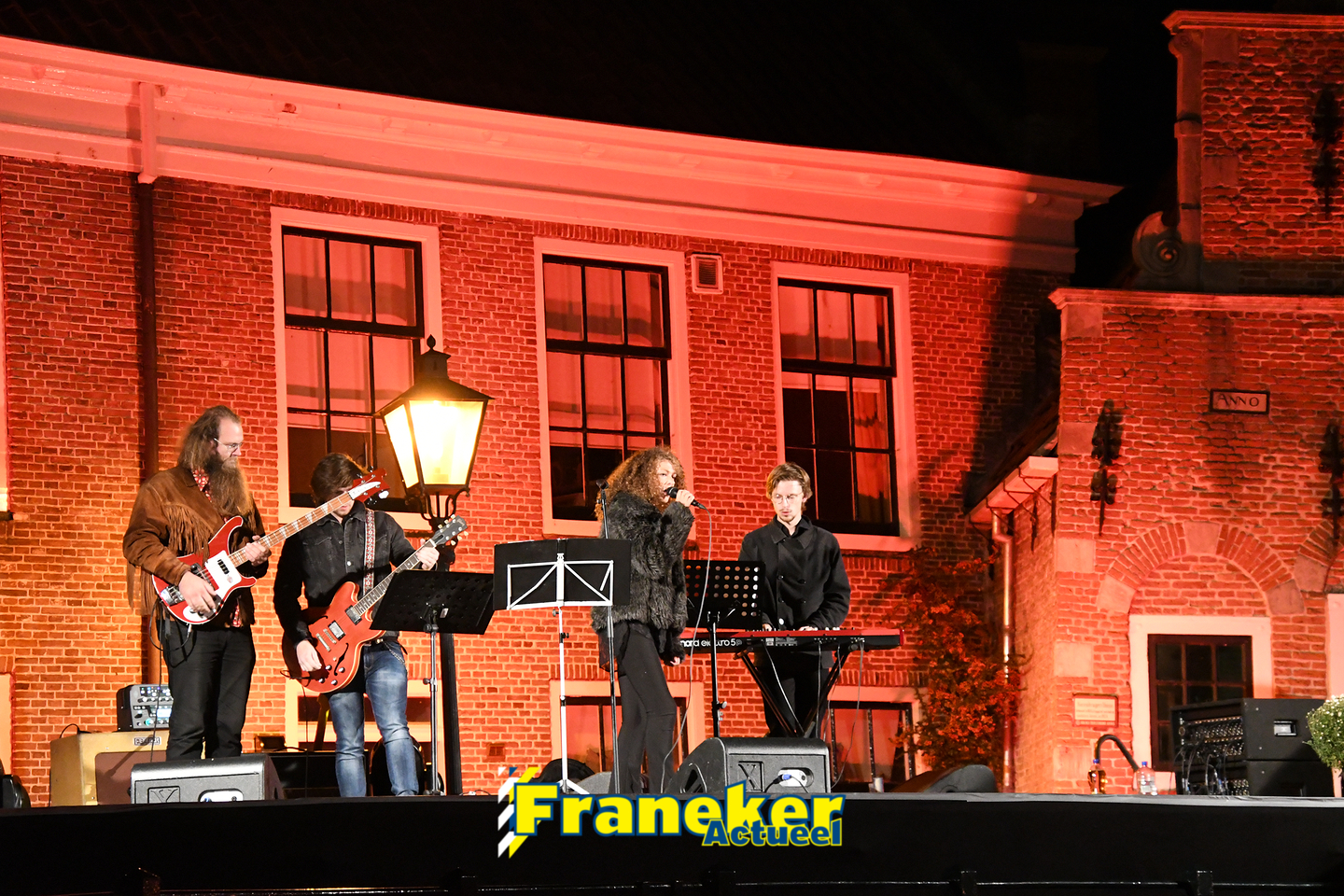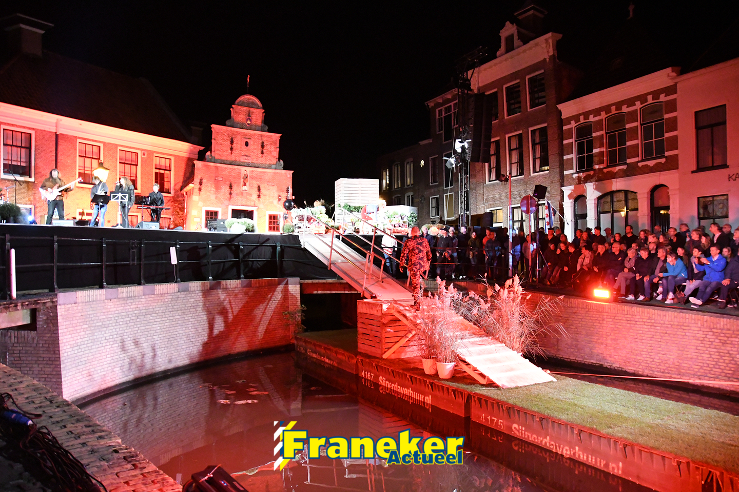 Langs de grachten voor het mooie, monumentale Korendragershuisje was het meeslepend theater- en muziekspektakel. Geschreven door regisseur Bart Kingma (Ried) en de band was samengesteld door Thomas Schiphof (Franeker).