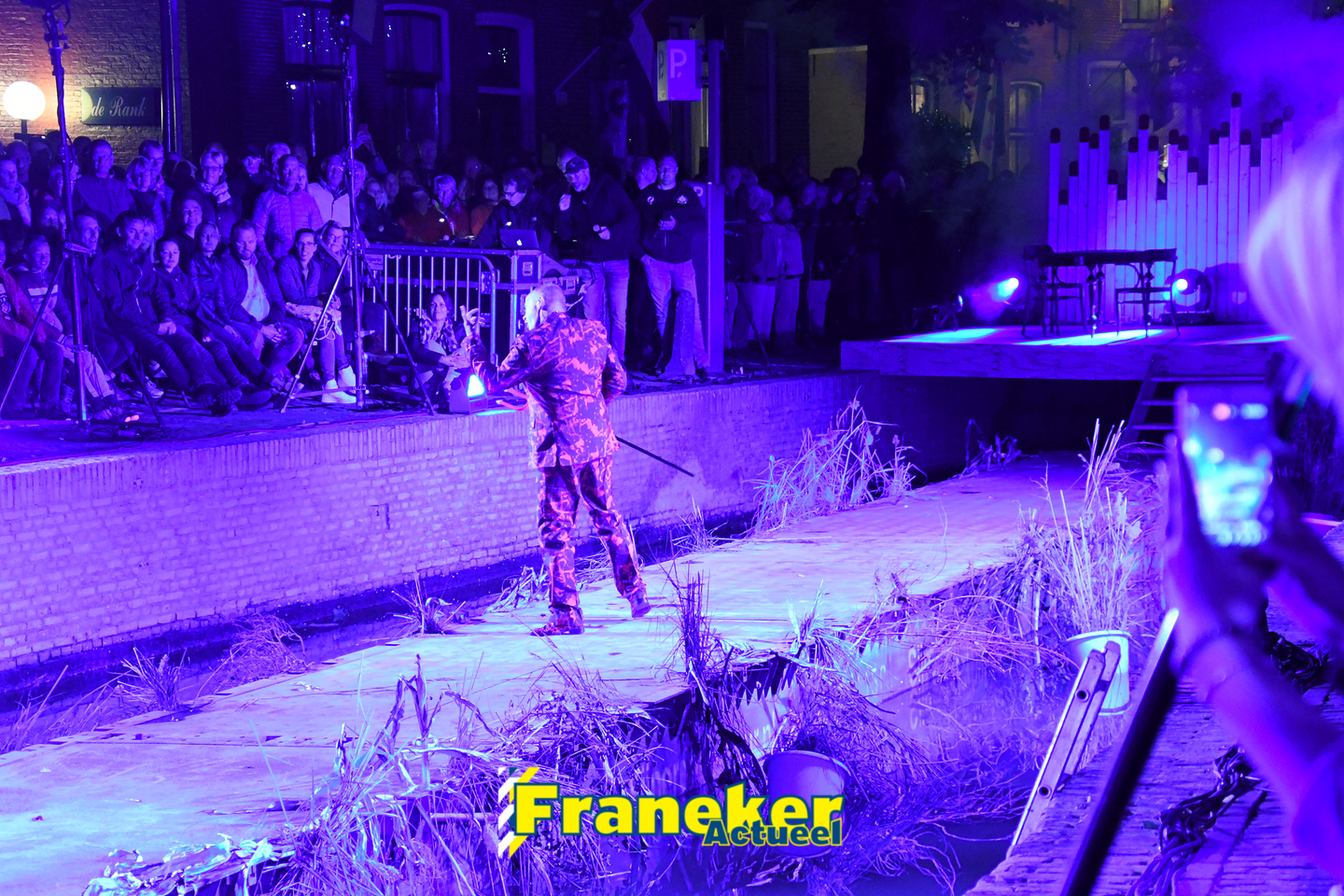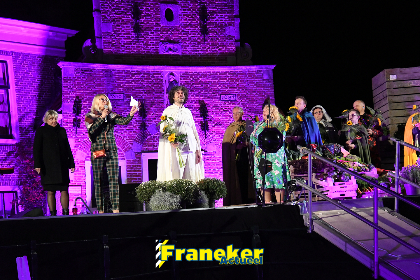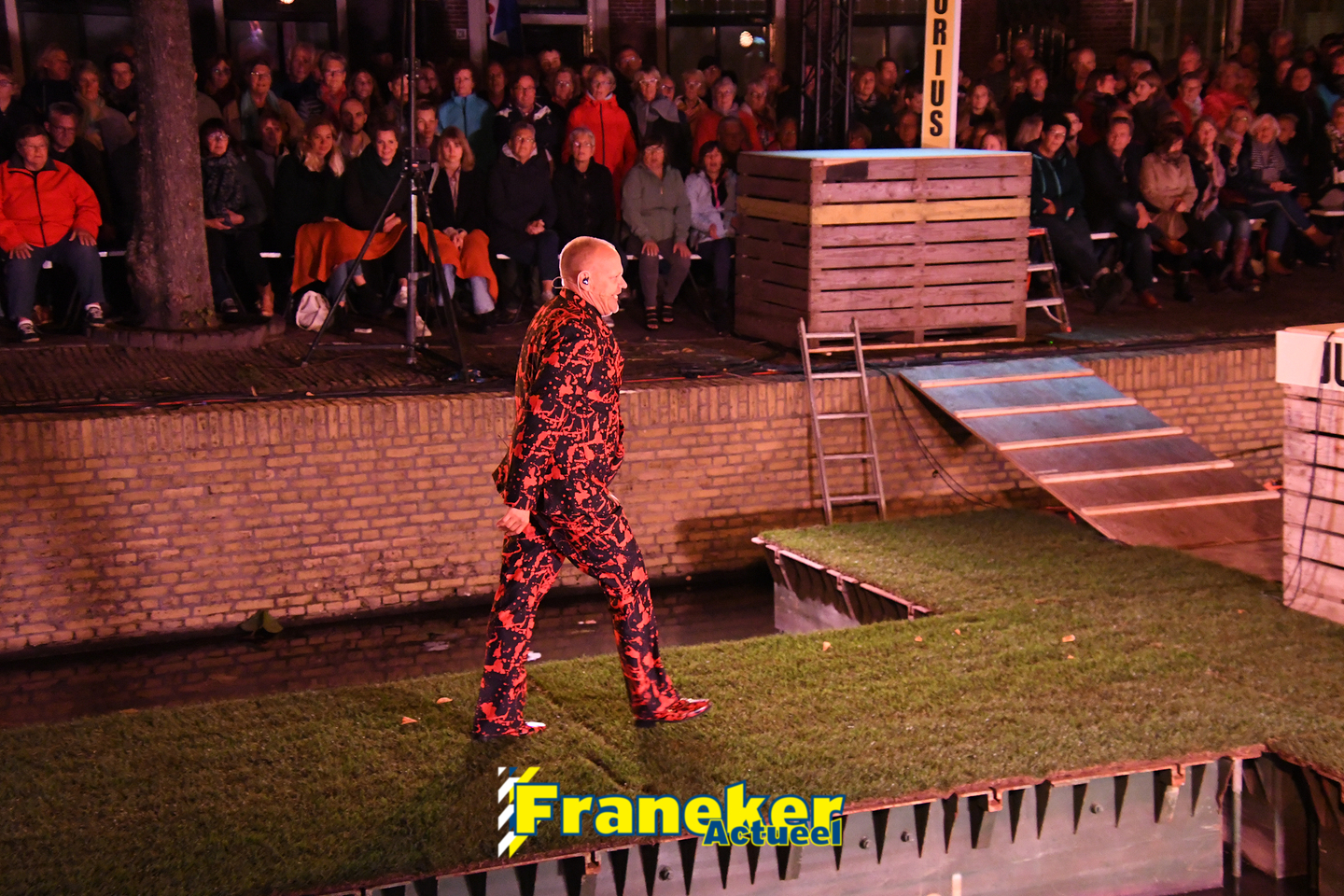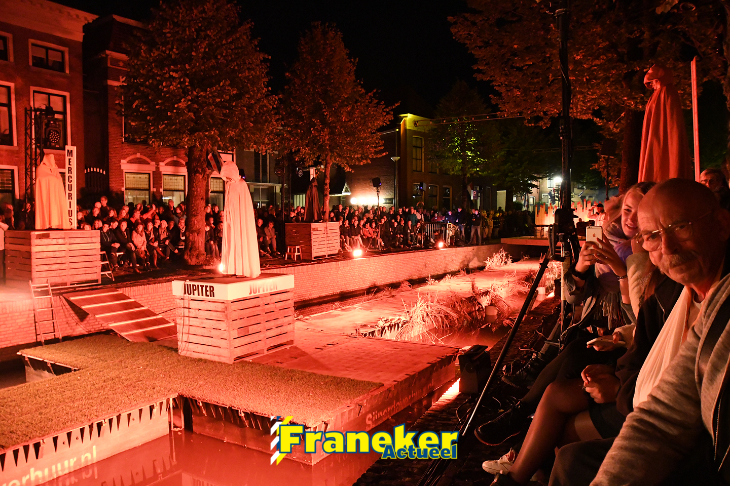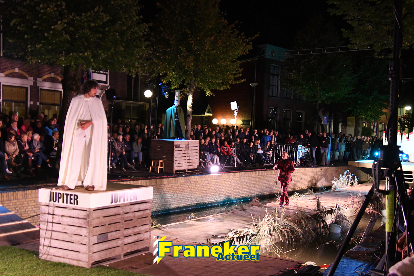 Langs de grachten voor het mooie, monumentale Korendragershuisje was het meeslepend theater- en muziekspektakel. Geschreven door regisseur Bart Kingma (Ried) en de band was samengesteld door Thomas Schiphof (Franeker).
