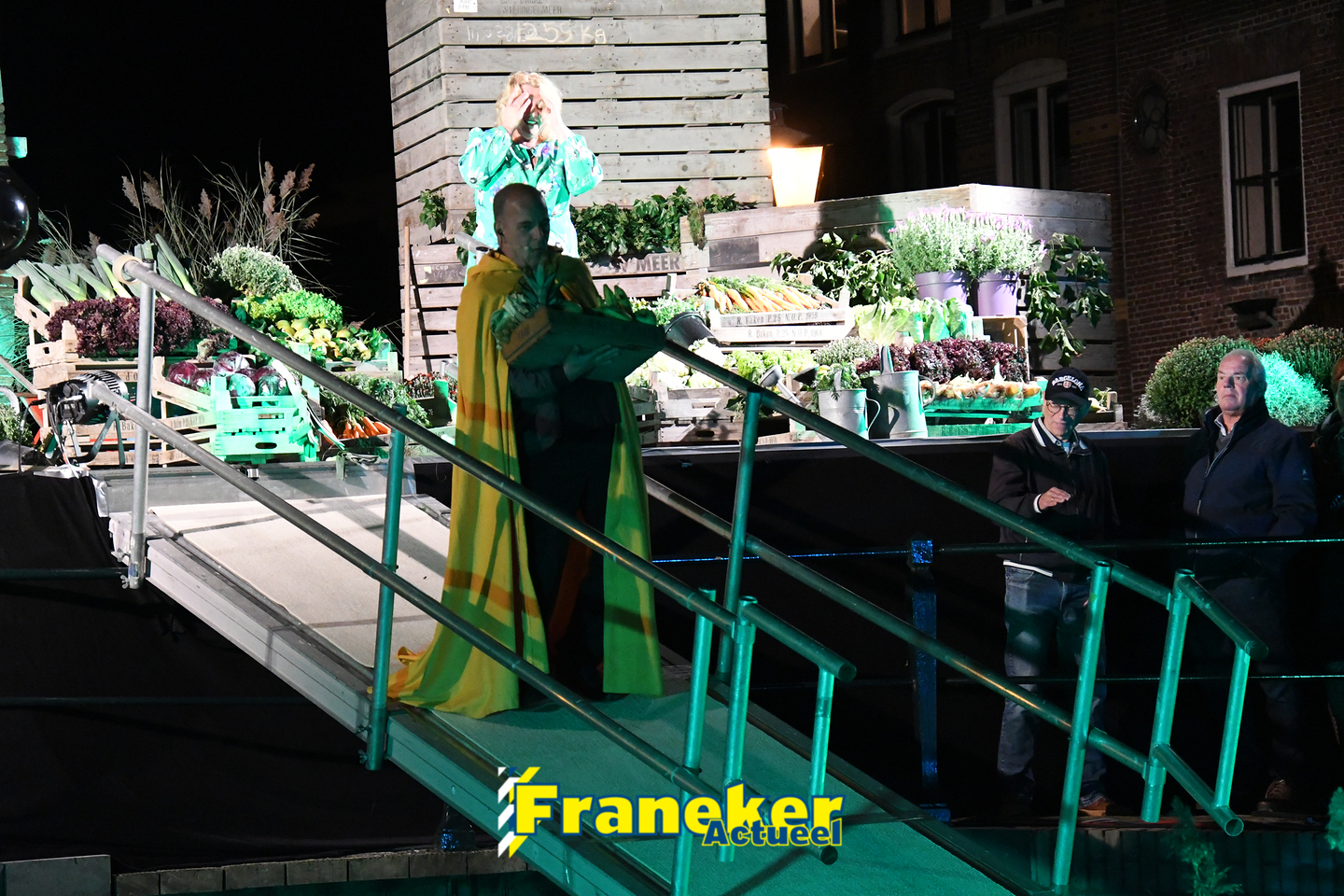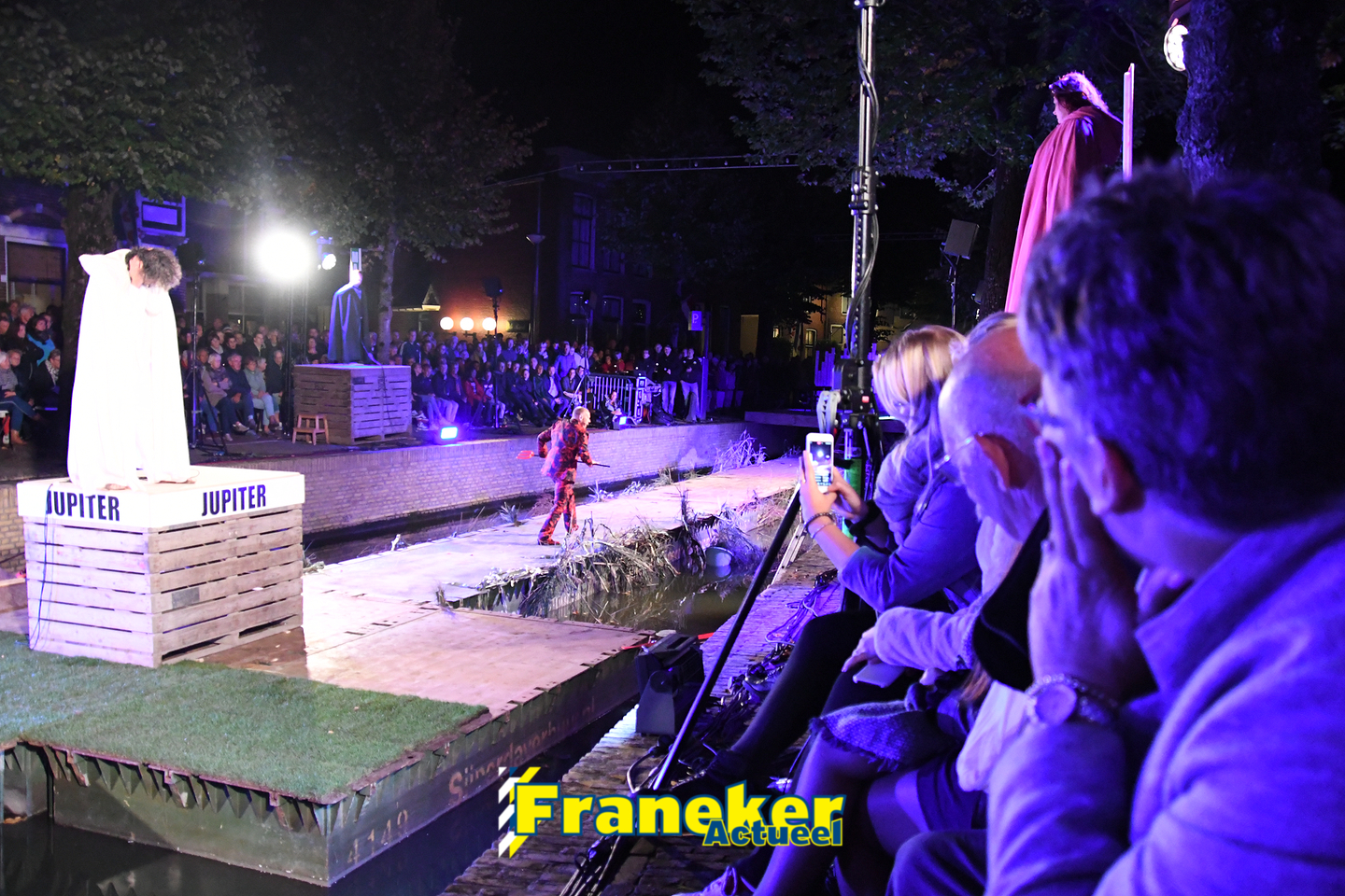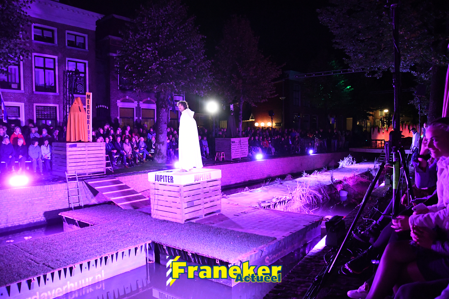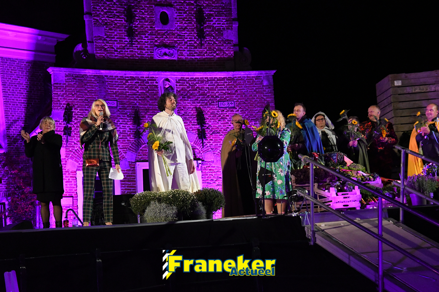 Langs de grachten voor het mooie, monumentale Korendragershuisje was het meeslepend theater- en muziekspektakel. Geschreven door regisseur Bart Kingma (Ried) en de band was samengesteld door Thomas Schiphof (Franeker).