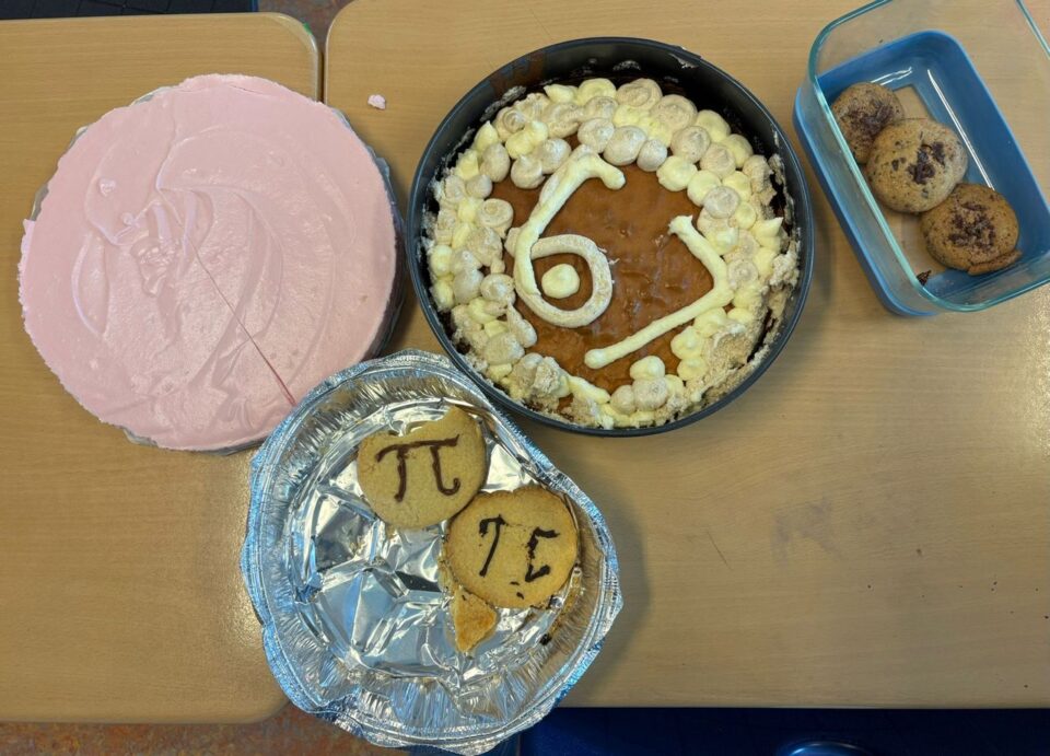Tijdens de wiskundelessen in een aantal eerste klassen werd onlangs Pi Day gevierd. Deze dag staat in het teken van het beroemde getal Pi. Een aantal leerlingen had zelf iets lekkers gemaakt dat te maken had met het getal π. Zo waren er verschillende taarten en andere hapjes die speciaal voor deze dag waren meegenomen. Ook werd er een verkiezing gehouden voor het getal van het jaar. Helaas wist het getal 67 met een overduidelijke meerderheid te winnen.