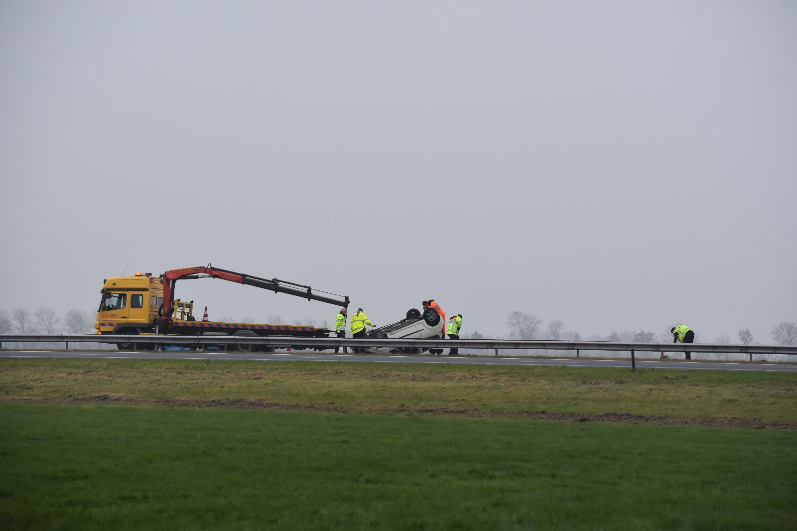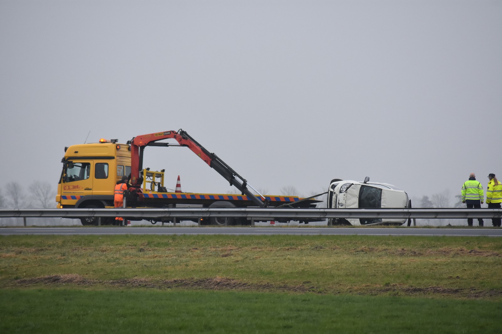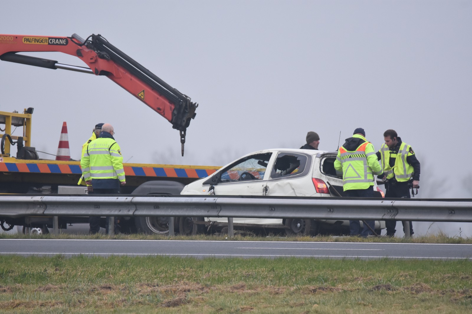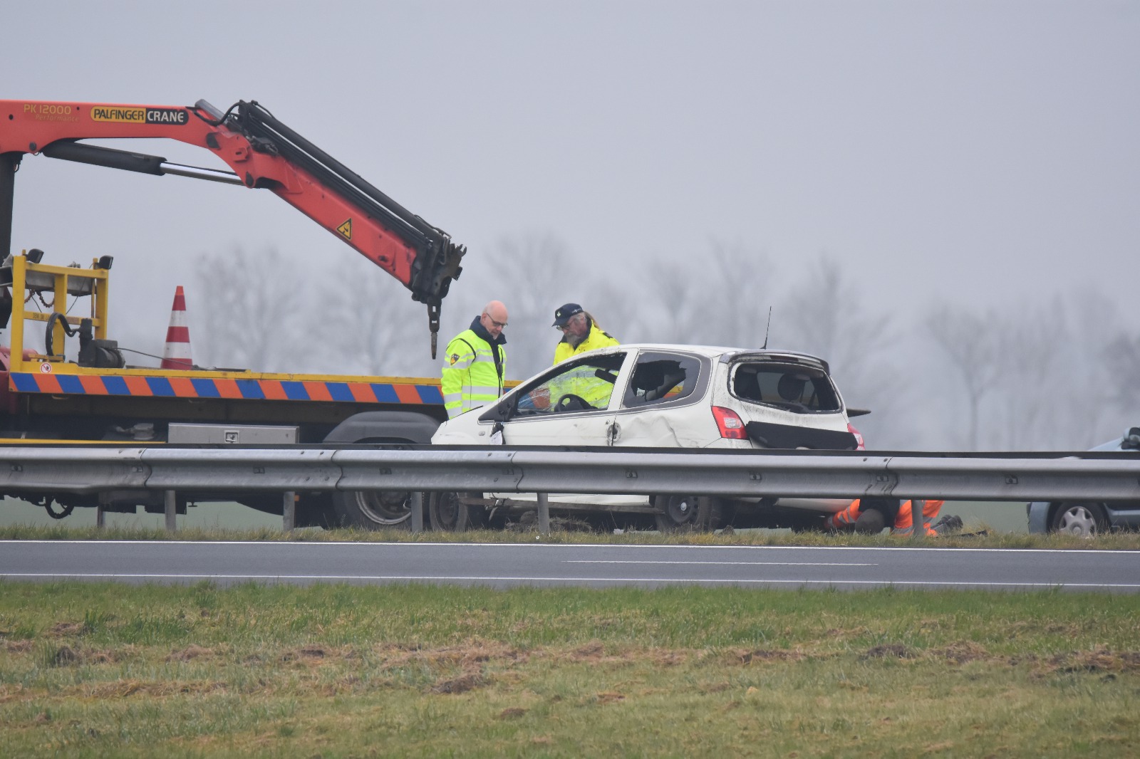 Een berger heeft de zwaar beschadigde auto opgehaald, tijdens deze werkzaamheden werd de A31 tijdelijk afgesloten