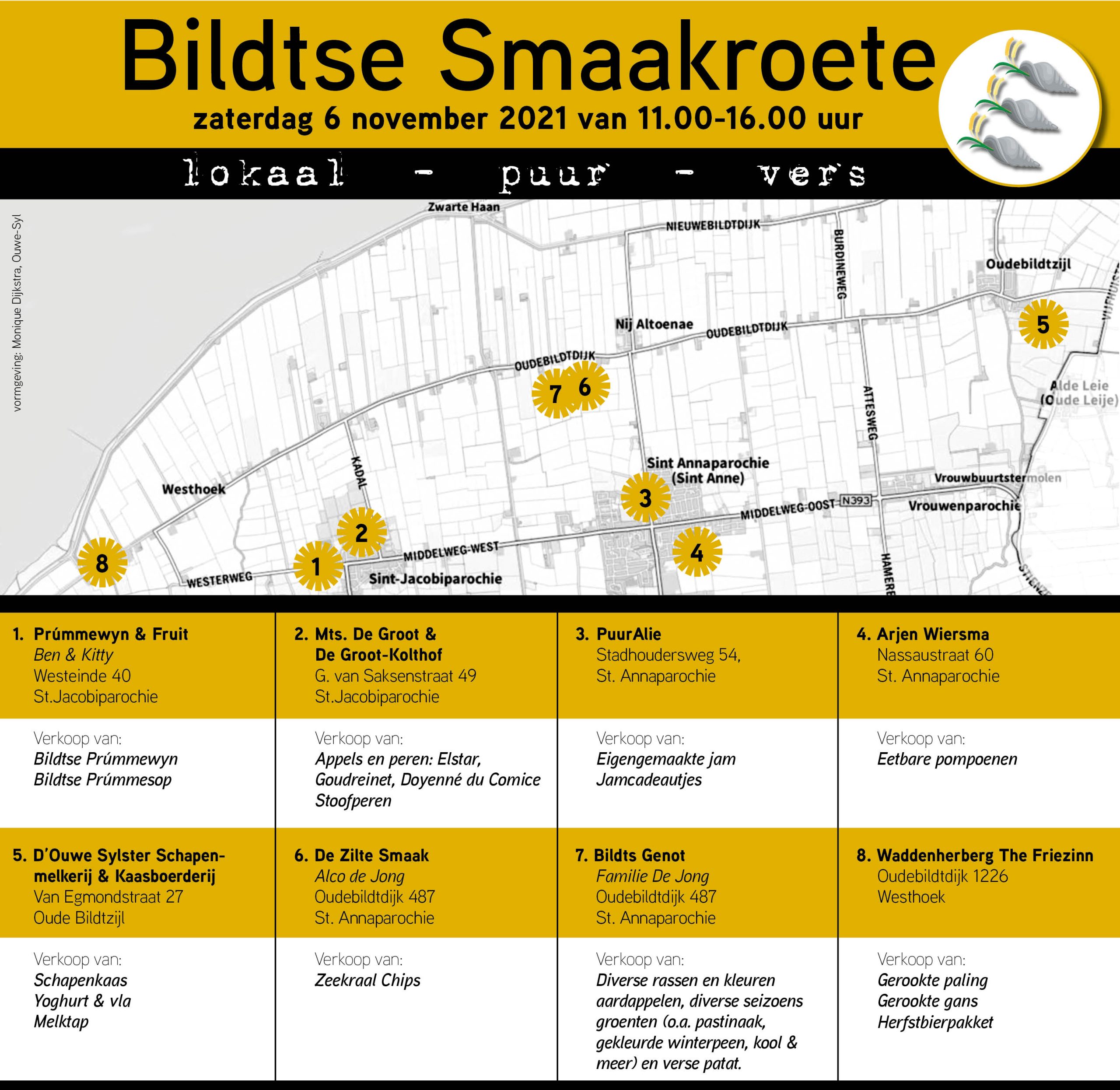 Voor de liefhebber van lokaal, vers en puur voedsel, rechtstreeks van het erf van de producent is dit een unieke mogelijkheid om naast het ervaren van de unieke smaak en eigenschappen van de streek ook eens een kijkje achter de schermen van de producent te nemen. Met hier en daar een wijziging in het deelnemersveld is er dit jaar weer voor iedereen veel bijzonders te ontdekken! De deelnemers aan de ‘Bildtse Smaakroete’ van 2021 zijn: