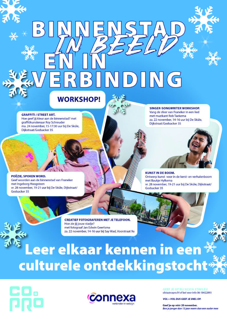 Samen ontmoeten, ontdekken en beleven we de binnenstad, als singer-songwriter, fotograaf, verhalenverteller of dichter, graffiti-artiest of als decoratie-kunstenaar. In november vinden de workshops plaats onder leiding van professionals, die je de kneepjes van het vak zullen leren.