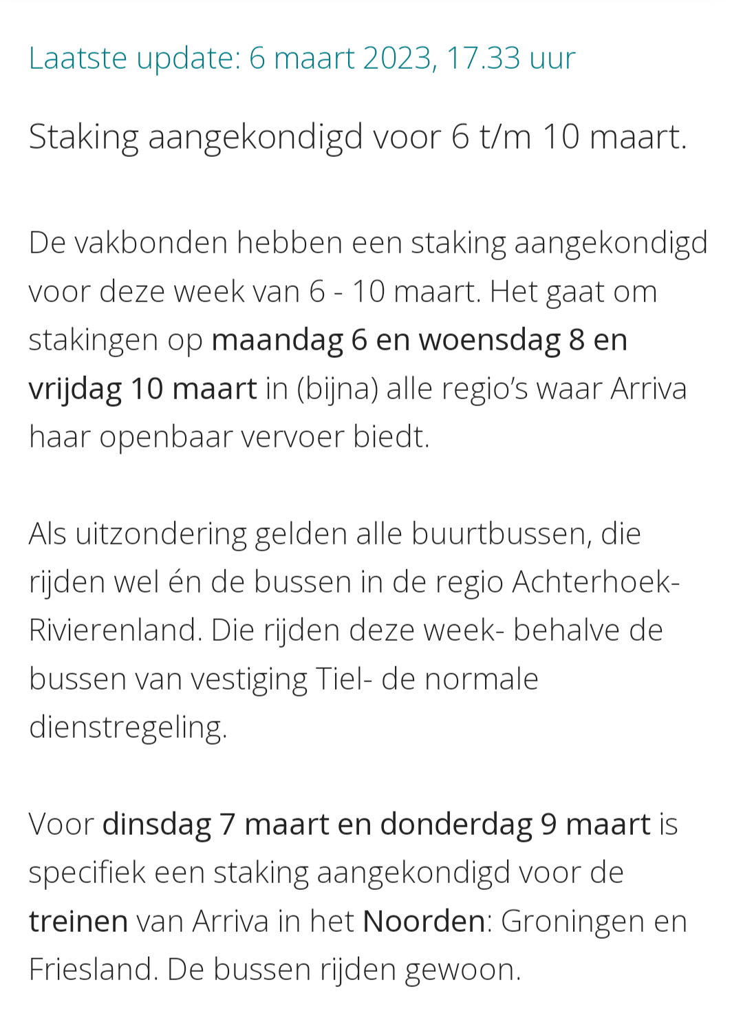 De eerder aangekondigde stakingsdagen voor deze week zijn 6, 8 en 10 maart. Daarbovenop komen dinsdag 7 en donderdag 9 maart. Deze 2 dagen zijn specifiek aangekondigd voor het Noorden van Nederland, Friesland en Groningen en het gaat om de treinen. Bussen rijden wel. Omdat het gaat om regionale staking aangekondigd door de vakbonden is de kans op uitval groter.