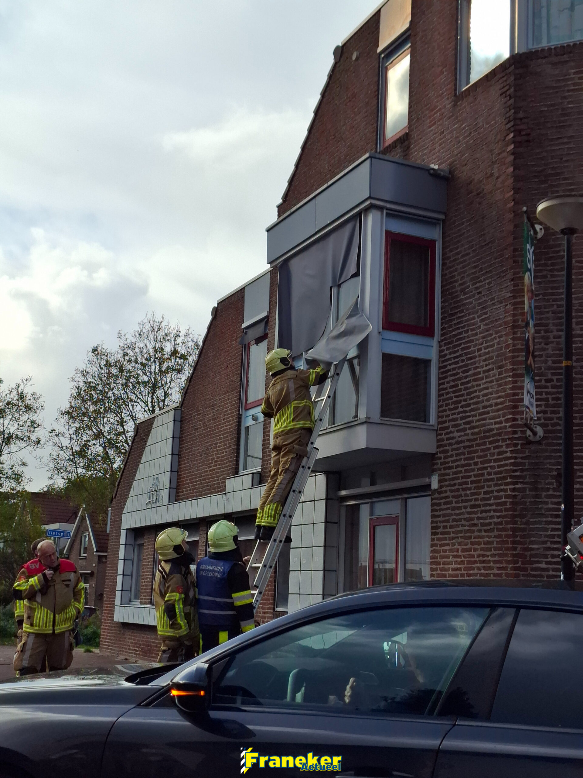De brandweer heeft het loszittende doek en frame veilig verwijderd, waarmee verdere schade of gevaar voor voorbijgangers werd voorkomen. Er raakte niemand gewond.