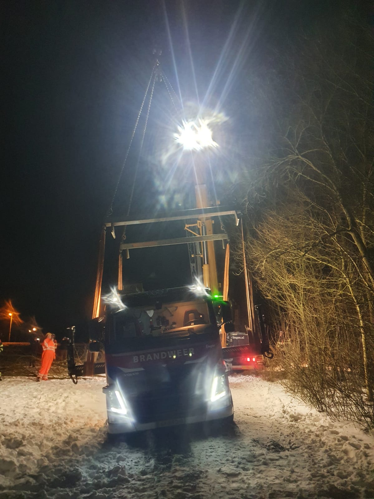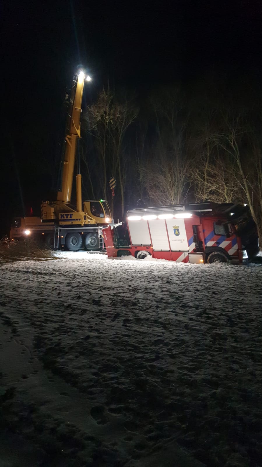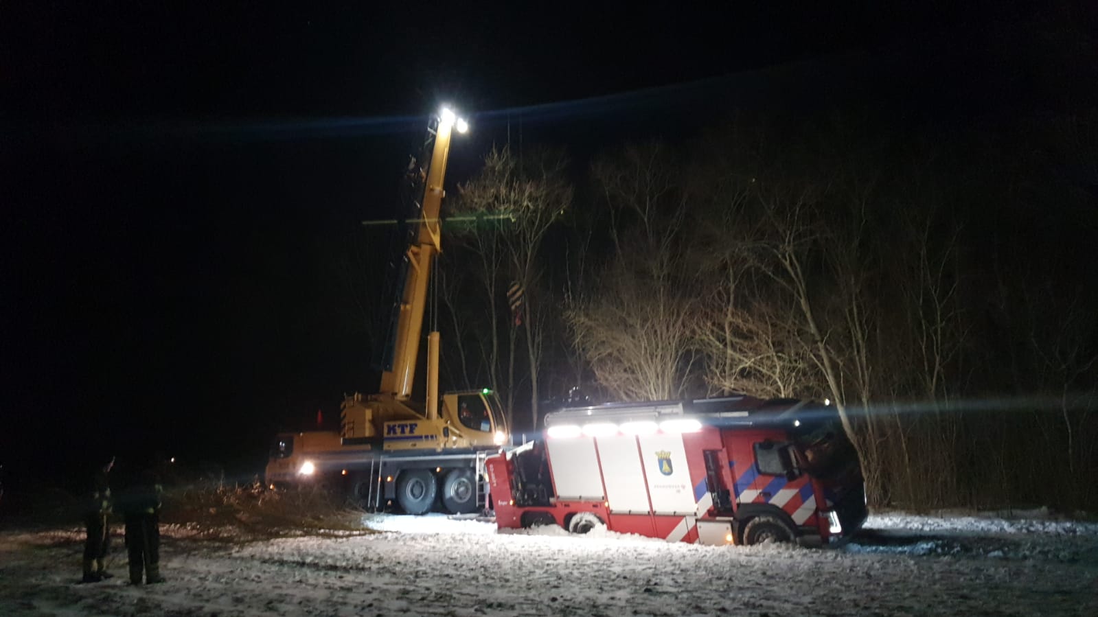 Diverse pogingen om met tractoren het voertuig weer op de weg krijgen lukte helaas niet. Uiteindelijk moest er een mobiele kraan er aan te pas komen om het voertuig weer op de weg te krijgen.