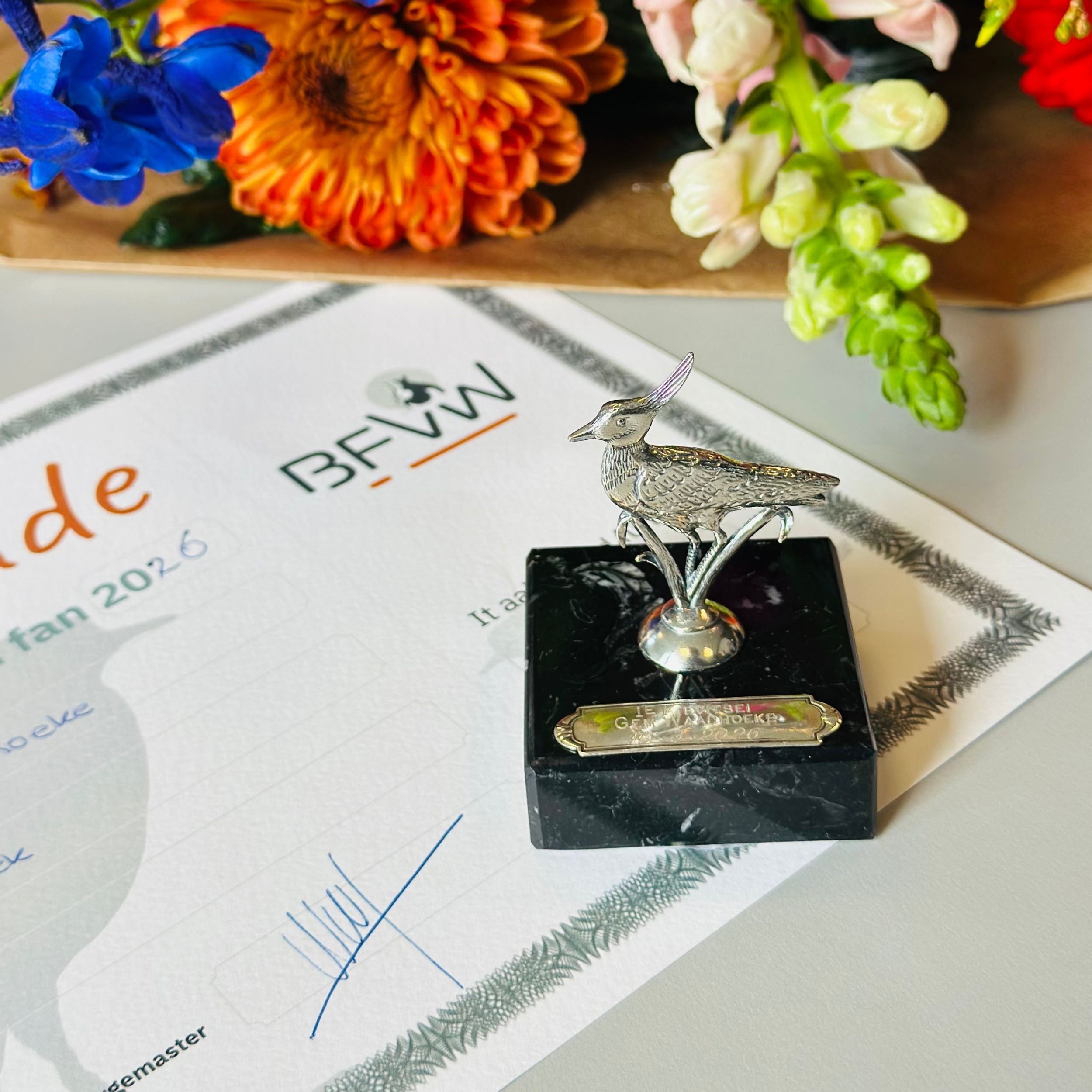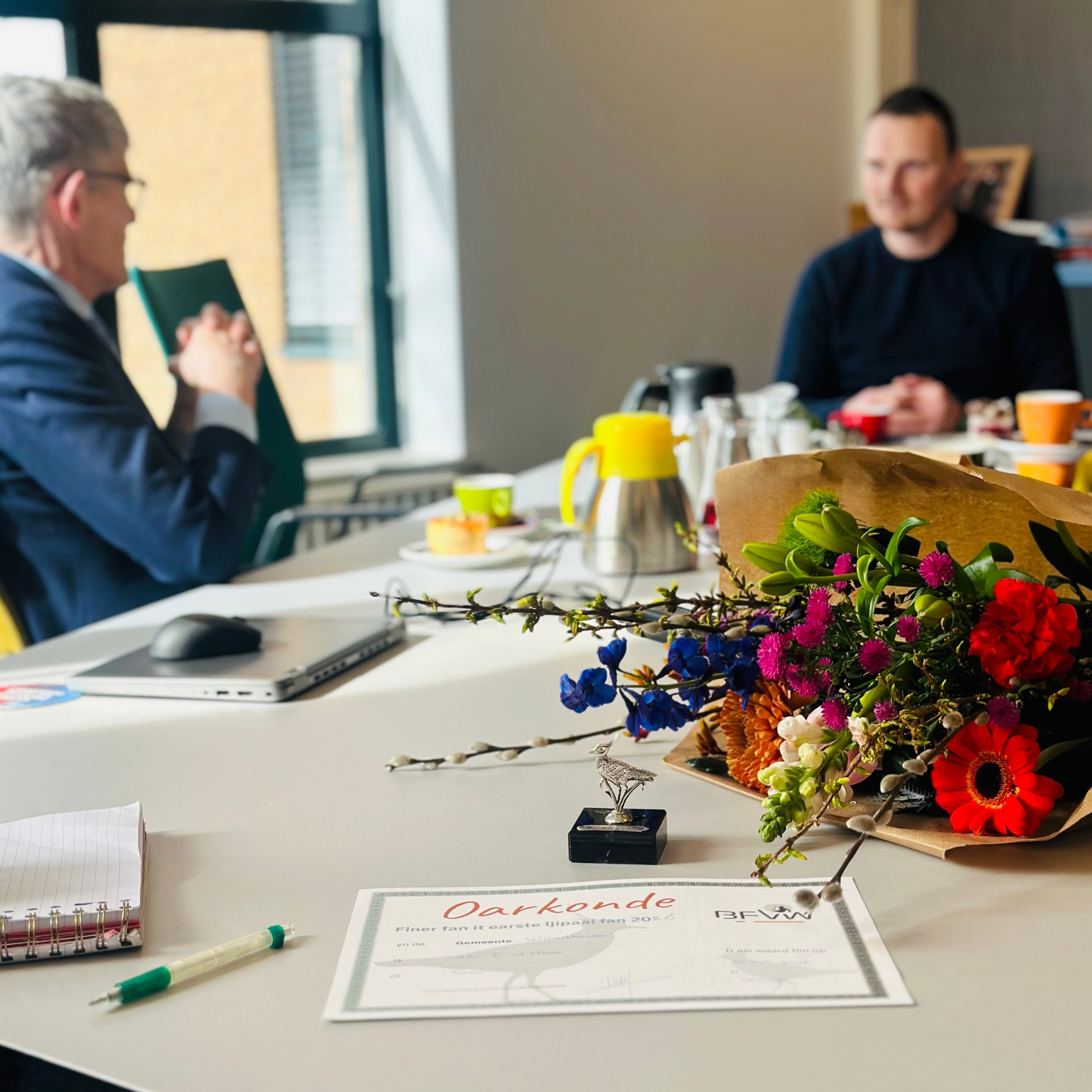 Burgemeester André van de Nadort feliciteerde Eduard vanmiddag (dinsdag 12 maart) in het gemeentehuis van Waadhoeke. Van der Hoek kreeg daarbij de oorkonde, het vindersloon en een bos bloemen. En ook ontving hij van Juwelier Kramer uit Franeker de Sulveren Ljip. De juwelier stelt deze prachtige prijs inmiddels al meer dan 30 jaar beschikbaar.