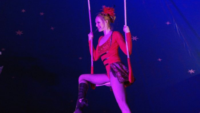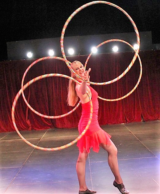De Amerikaanse Laura Cohen straalt in een act waarbij zij het spel van de hoela hoep verheft tot ware Circuskunst. In de lucht combineert zij kracht en charme aan de trapeze als een ‘Lady in Red’.