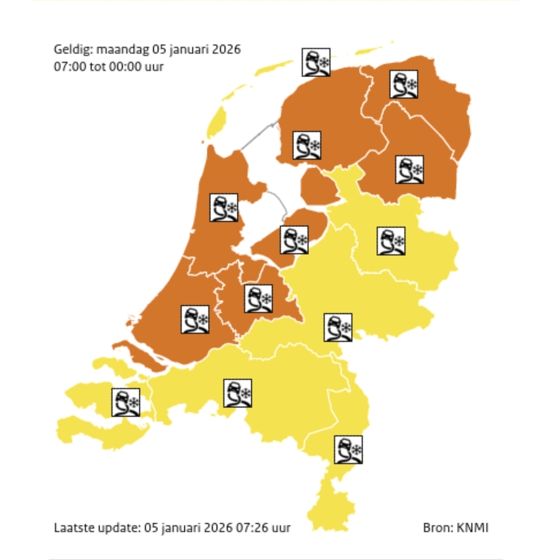 Voor de provincie Friesland is code oranje van kracht vanwege sneeuwval, voorlopig geldt code oranje vandaag tot 12 uur, daarna is code geel van kracht. Vanochtend, ook tijdens de ochtendspits, kan er nog 2 tot 5 centimeter sneeuw vallen. Plaatselijk kan dit oplopen tot 5 à 8 centimeter.