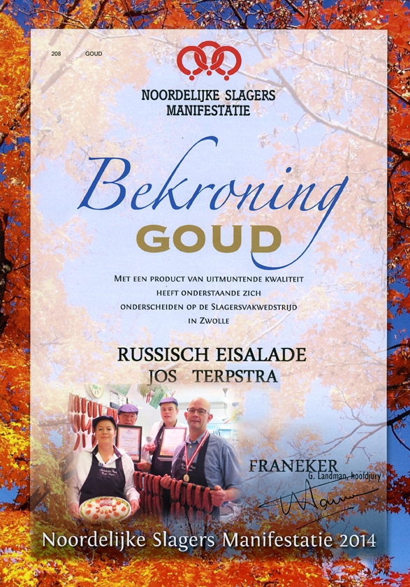De ambachtelijke Slagerij Emile Terpstra uit Franeker heeft op de Noordelijke Slagers Manifestatie met de Friesche turf gerookte Drogeworst de score ‘Goud met Ster’ behaald. Dat is de hoogst haalbare score. Daarnaast werd de  Russische eiersalade van Emile Terpstra beoordeeld met goud.