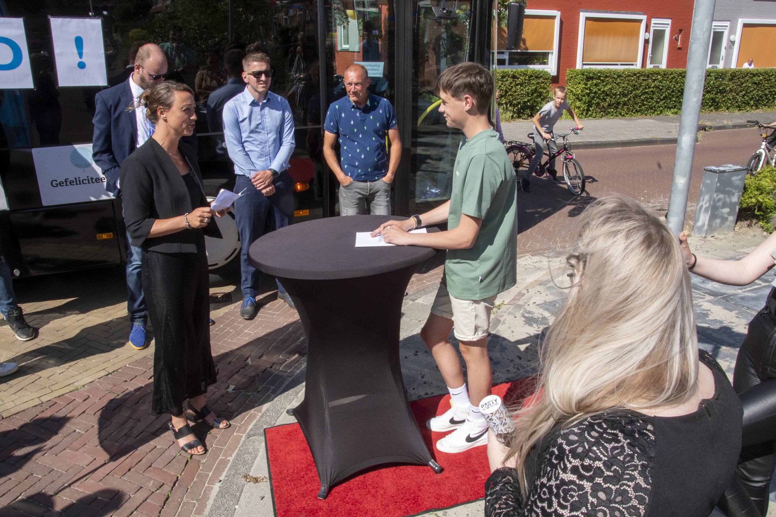 vrijdag met twee touringcars de diploma’s bij alle geslaagde leerlingen thuis uitgereikt. Zoiets blijft niet onopgemerkt in de buurt.