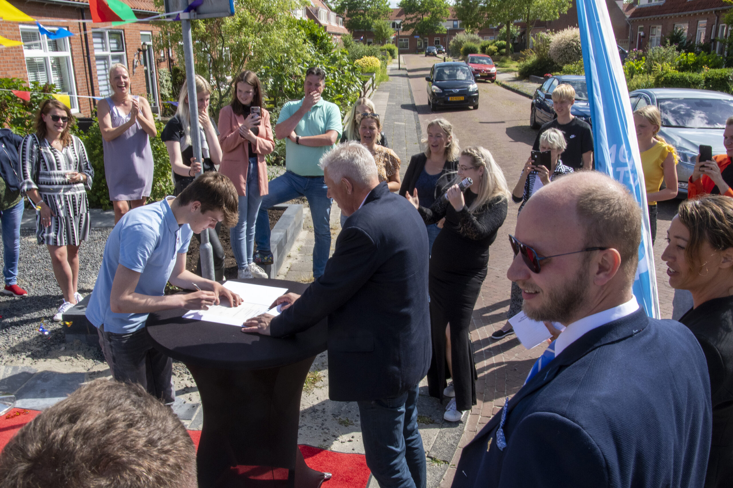 Stampende discobeats klinken namelijk door de Franeker Ypeijsingel als de versierde touringcar voor het huis van Demi Tichelaar stopt. Docenten rollen de rode loper uit, plaatsen een statafel en na een toespraakje kan het diploma worden getekend. En zo gaat dat bij alle geslaagde leerlingen. Ook bij Kjeld Grijpma (17) en Stijn de Vries (15), familie van elkaar, die iedereen bij Kjeld thuis hebben uitgenodigd.