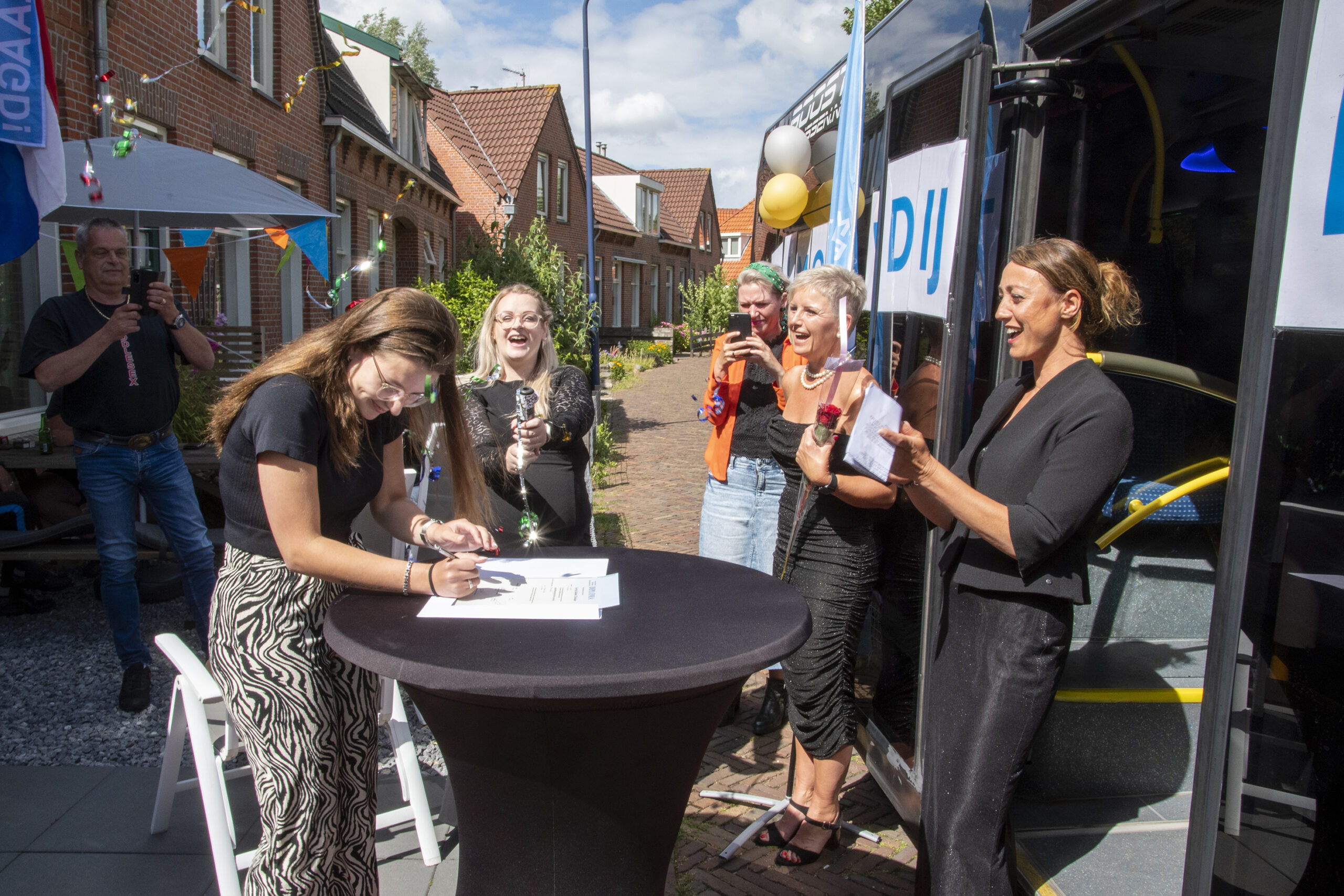 Het is het derde keer dat de school de diploma’s vanuit ‘discobussen’ uitreikt. Eerst vanwege de coronabeperkingen, maar het beviel eigenlijk best wel goed en op school is de ruimte beperkt. ,,Elke leerling zou dan twee gasten mee kunnen nemen, terwijl je dit met je hele familie wilt delen. ,,Zo kunnen ze uitnodigen wie ze maar willen.’’