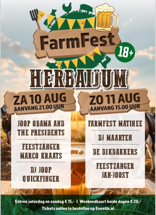 Zin in een feestje? Dat kan en wel op zaterdag 10 augustus en zondag 11 augustus! Dan vind weer het FarmFest (18+) Herbaijum plaats.