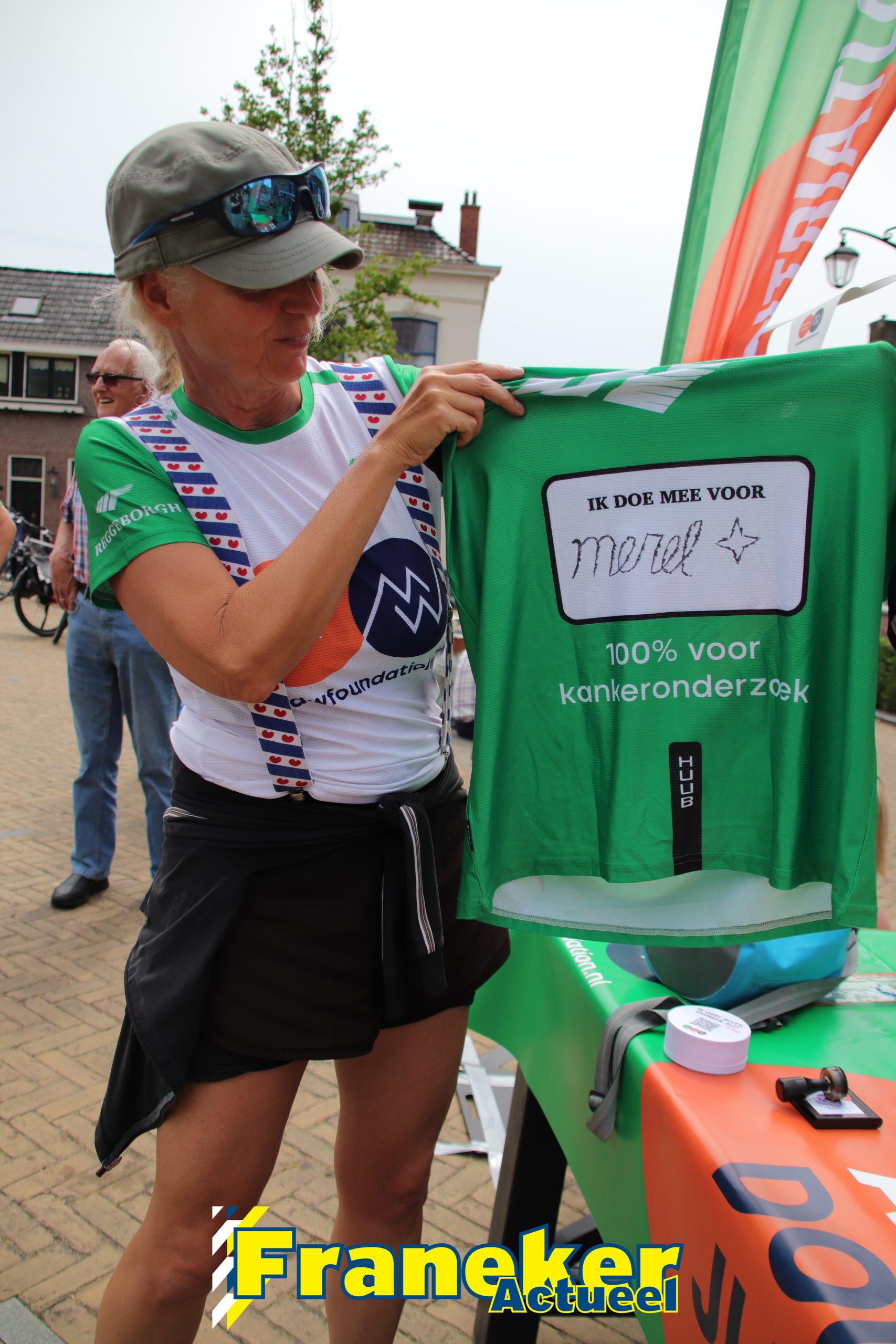 Maarten van der Weijden is de uitdaging van de triatlon aangegaan om geld in te zamelen voor het financieren van wetenschappelijk onderzoek naar kanker. Ook vele vrijwilligers hebben (in)direct te maken (ge)had met kanker. Zo ook het rayonhoofd van Franeker, Gerda. Zij zet vandaag de stempel op de stempelkaart van Maarten. Gerda heeft haar nichtje verloren ‘Merel’, ze overleed op 31 jarige leeftijd aan kanker.