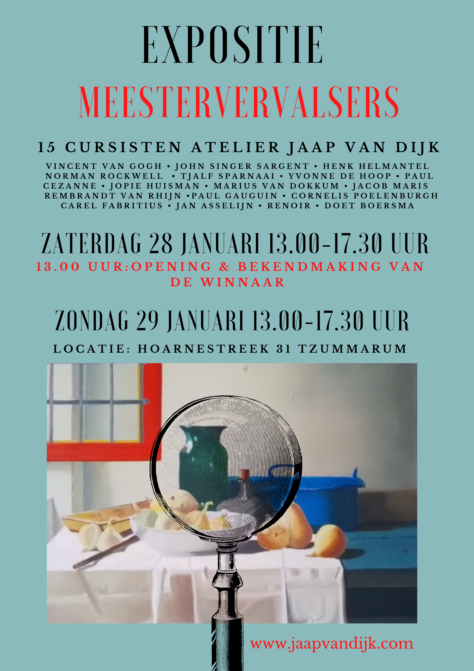 Dit weekend exposeren een flink aantal cursisten van Atelier Jaap van Dijk hun ” Meester vervalsingen”. Wie daar het beste in is geslaagd, wordt bepaald door een driekoppige professionele jury en zaterdag a.s. om 13.00 uur bekend gemaakt. Het belooft echt een heel mooie expositie te worden.