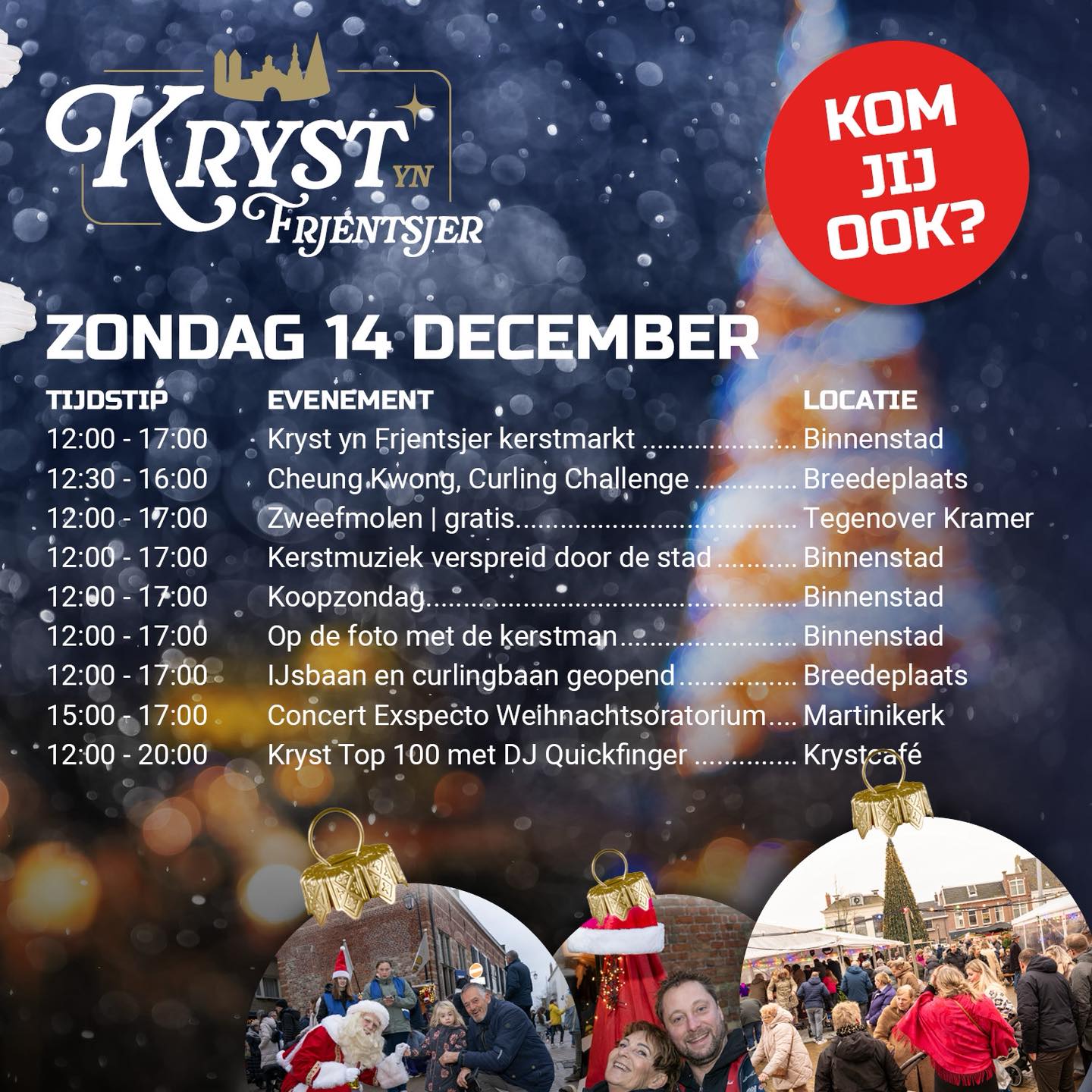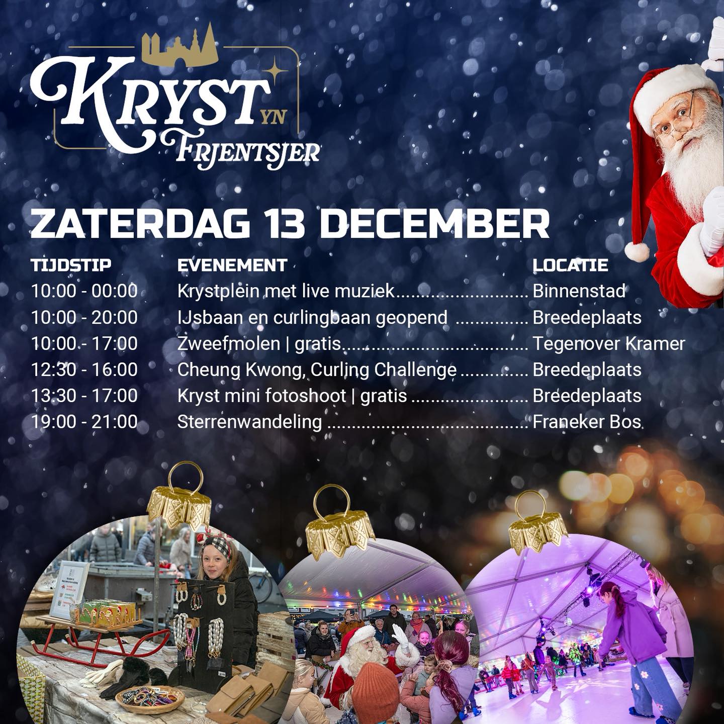 Op zondag staat de binnenstad van Franeker van 12.00 tot 17.00 uur volledig in het teken van Kryst yn Frjentsjer. De kerstmarkt vult de straten, winkels zijn geopend tijdens koopzondag en door de hele stad klinkt kerstmuziek. Bezoekers kunnen op de foto met de kerstman, schaatsen en curlen op de Breedeplaats of genieten van het Weihnachtsoratorium in de Martinikerk. De dag én avond worden muzikaal omlijst met de Kryst Top 100 in het Krystcafé.