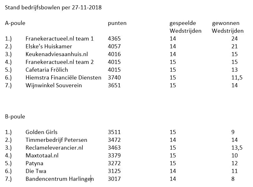 In de B-poule lijkt het team van Allround Timmerbedrijf Petersen de beste papieren te hebben voor de winst in deze poule. De strijd om de overige podiumplaatsen ligt nog volledig openen en is dan ook vooraf niet te voorspellen wie er op welke plaats zal eindigen. Zelfs het team van Die Twa met de bowlers Lieuwe Visser en Irene van Staveren die het gehele seizoen al onderaan bungelen kruipen steeds meer omhoog en zijn nog niet geheel kansloos voor een podiumplaats Benieuwd wie er uiteindelijk met de prijzen aan de haal gaan, kom dinsdag 4 december tijdens de laatste speelronde gerust een kijkje nemen bij bowlingcentrum Bloemketerp.