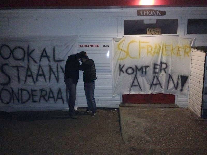 De aftrap van de derby VV Haringen tegen SC Franeker is vanmiddag om 14.00 uur. Maar de derby tussen beide supporters is al begonnen. Een aantal Franekers brachten zaterdag avond een bezoekje aan Harlingen. Hiermee reageren de Franekers op ludieke wijze op de tekst die de Harlingers afgelopen week bij Sport Club Franeker hebben opgehangen. De Harlingers wezen de klokkendieven op het feit dat zij onderaan staan in de derde klasse, Franeker reageerde met de volgende tekst: “Ookal staan we onderaan SC Franeker komt er aan!” Er worden vanmiddag veel toeschouwers verwacht bij deze derby. De wedstrijd is vanmiddag live te volgen via @Scfranekerlive