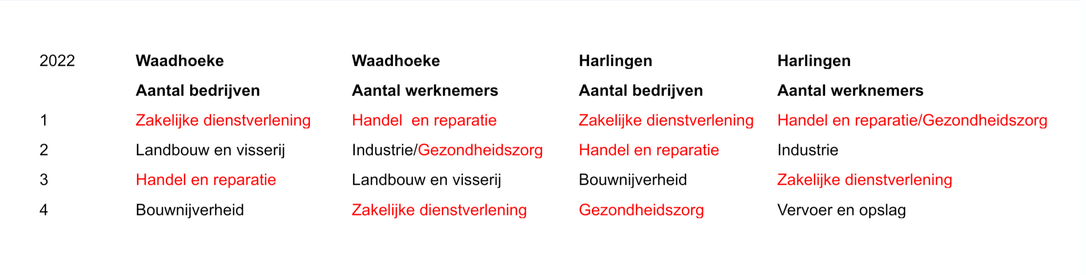De Rekenkamer vergelijkt de aanpak van Waadhoeke met analyses van het Fries Planbureau. Het gemeentelijke actieprogramma zet vrij fors in op de sectoren agri en maritiem en brengt hiermee een alternatief van het planbureau in stelling: selectief omgaan met economische activiteit. Met deze keuze zet de gemeente minder in op de grootste sectoren waar men de grootste arbeidskrapte verwacht. . Als een top vier van grootste sectoren kan worden samengesteld, ziet deze top er voor 2022 als volgt uit, waarbij de rode sectoren de sectoren zijn waar men de grootste arbeidskrapte verwacht: