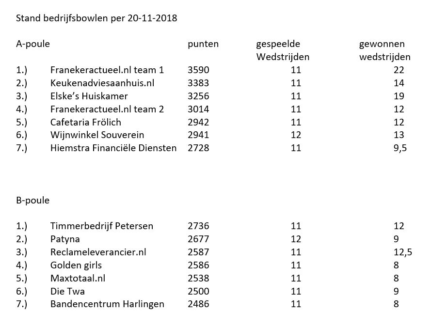 In de A-poule blijft het stuivertje wisselen om de podium plaatsen. De teams van Franekeractueel 1, Keukenadviesaanhuis.nl en dagbesteding Elske’s Huiskamer maken er een spannende competitie van. Het laatst genoemde team had tijdens de eerste wedstrijd nog last van de “Herfstdip” en lieten zich verrassen door het team van Wijnwinkel Souverein.