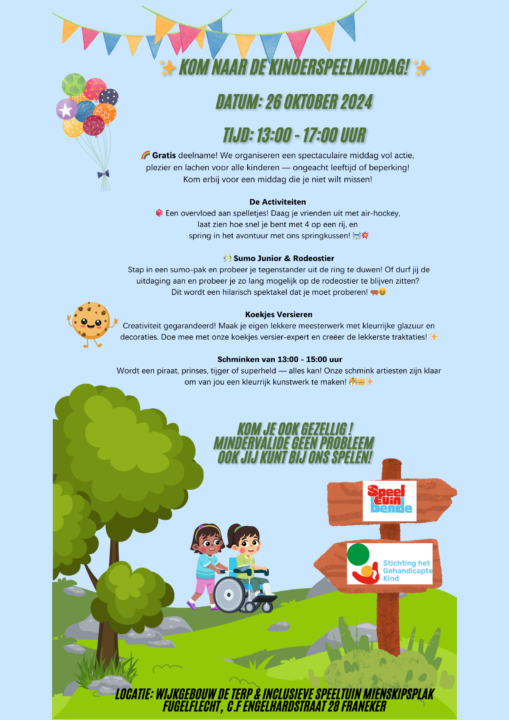 Op zaterdag 26 oktober organiseert Stichting Arkens op de gloednieuwe inclusieve Samenspeelplek It Mienskipsplak Fûgelflecht te Franeker een feestelijke Samenspeeldag. Met suikerspinnen en een springkussen, airhockey, 4 op een rij, sumo junior en een rodeostier en nog veel meer. Waar kinderen met en zonder beperking heerlijk kunnen samenspelen. De speeltuin is door haar brede paden goed toegankelijk voor mensen in een rolstoel.