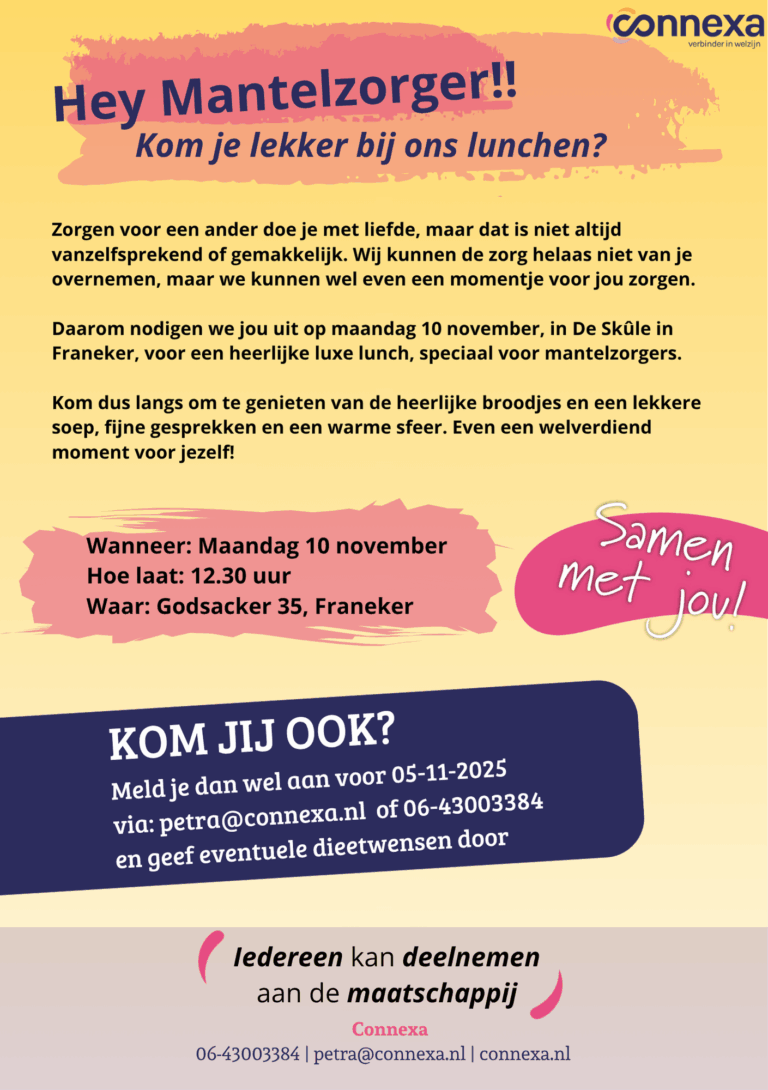 Aanmelden verplicht! Meld je uiterlijk voor 05-11-2025 aan voor via: petra@connexa.nl of 06-43003384