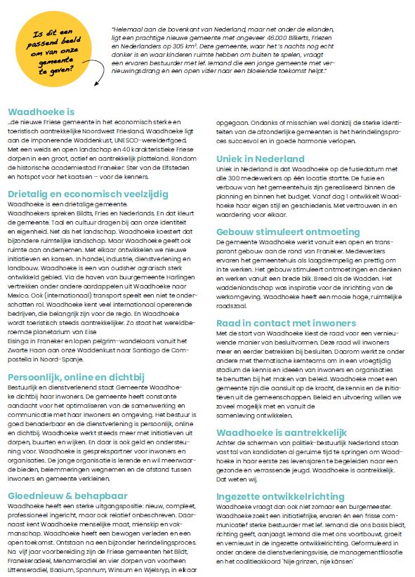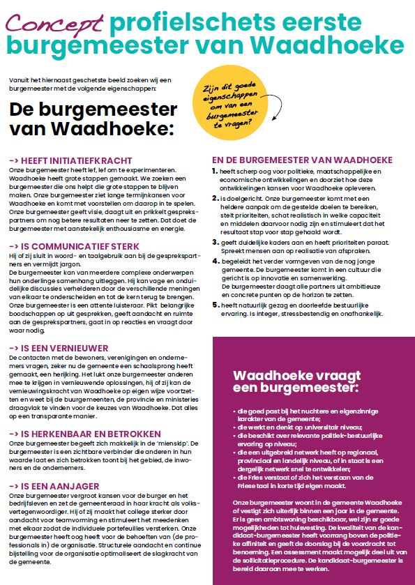 Deze concept-profielschets staat vandaag in de Franeker Courant en de Bildtse Post. Daarnaast is de profielschets te downloaden via de website van de gemeente www.waadhoeke.nl