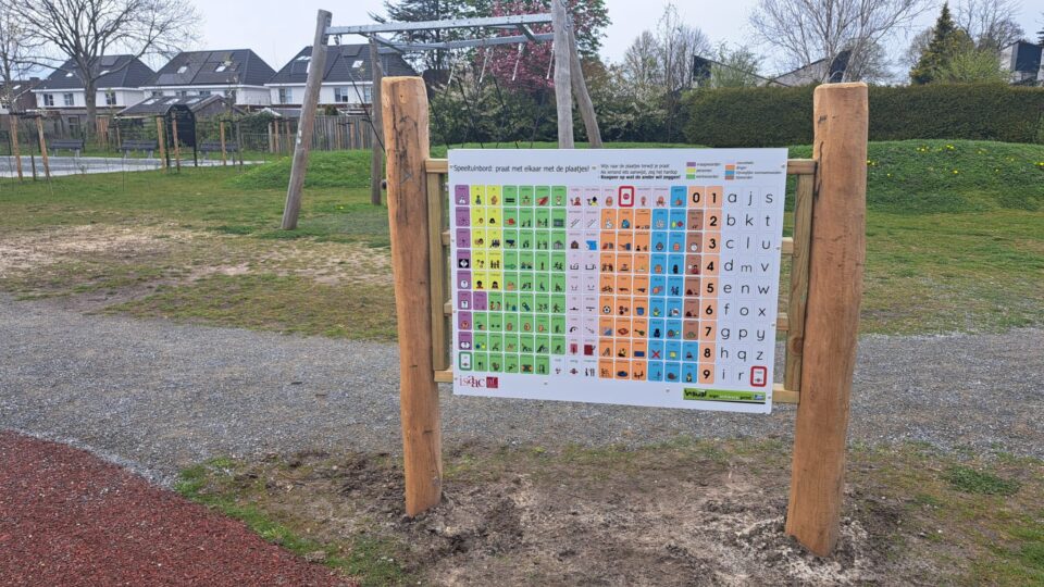 Op het speelplein is een speciaal communicatiebord geplaatst met de titel: “Praat met elkaar met de plaatjes.” Het bord maakt het mogelijk voor kinderen én volwassenen om met elkaar te communiceren door middel van afbeeldingen. Dit is van grote waarde voor mensen die niet (vloeiend) kunnen spreken, anderstalig zijn, of moeite hebben met het begrijpen van gesproken taal. Door simpelweg naar een plaatje te wijzen, kunnen kinderen aangeven dat ze geduwd willen worden op de draaimolen, dat ze het koud hebben of hulp nodig hebben. Het bord is ontwikkeld om inclusie en begrijpelijke communicatie te stimuleren, zodat écht iedereen mee kan doen.
