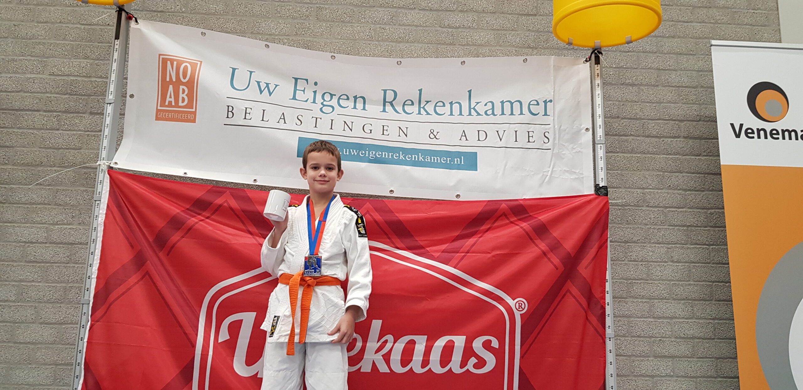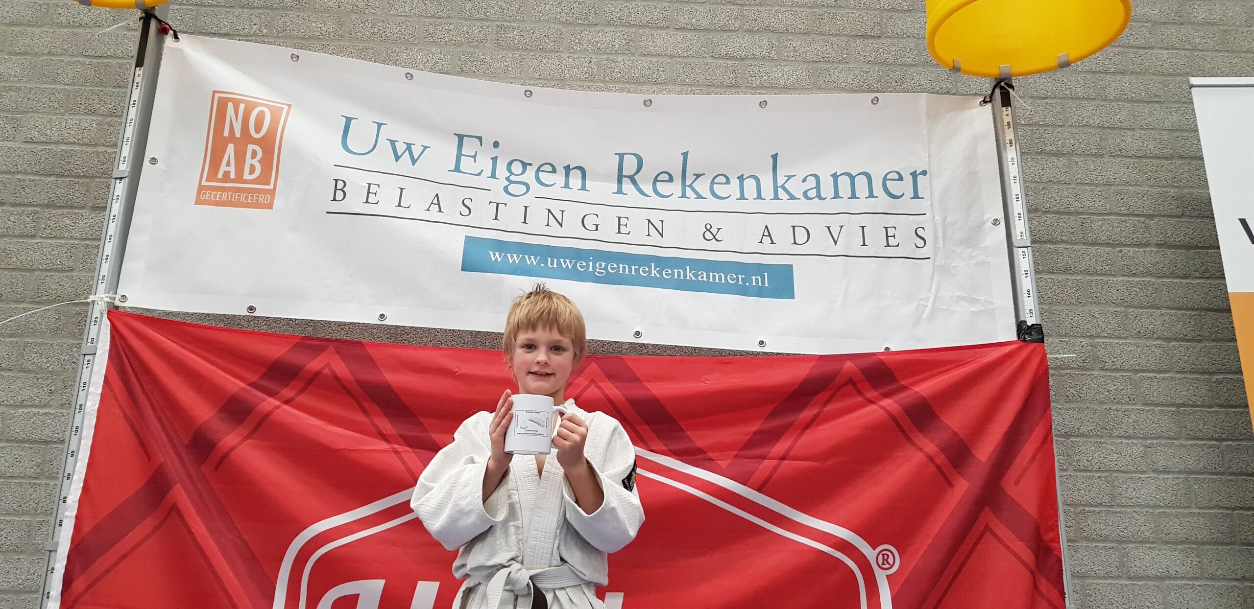 Auke begon de dag goed en wist 3 maal een ippon te scoren. Mooie worpen en goede stevige houdgrepen, helaas ook één verloren. De nummers 1 en 2 hadden beide 3 winst partijen en 30 punten. Omdat Auke de 1e wedstrijd had verloren is het een 2e plek geworden.