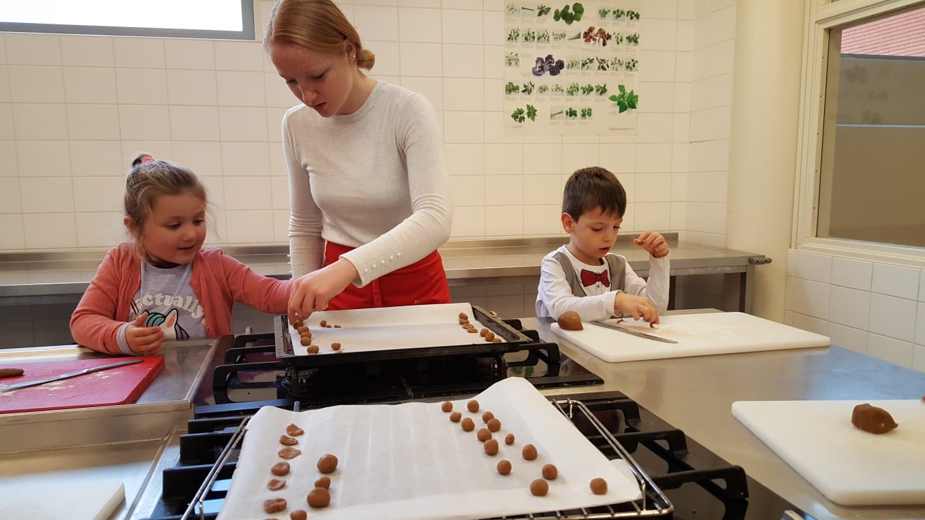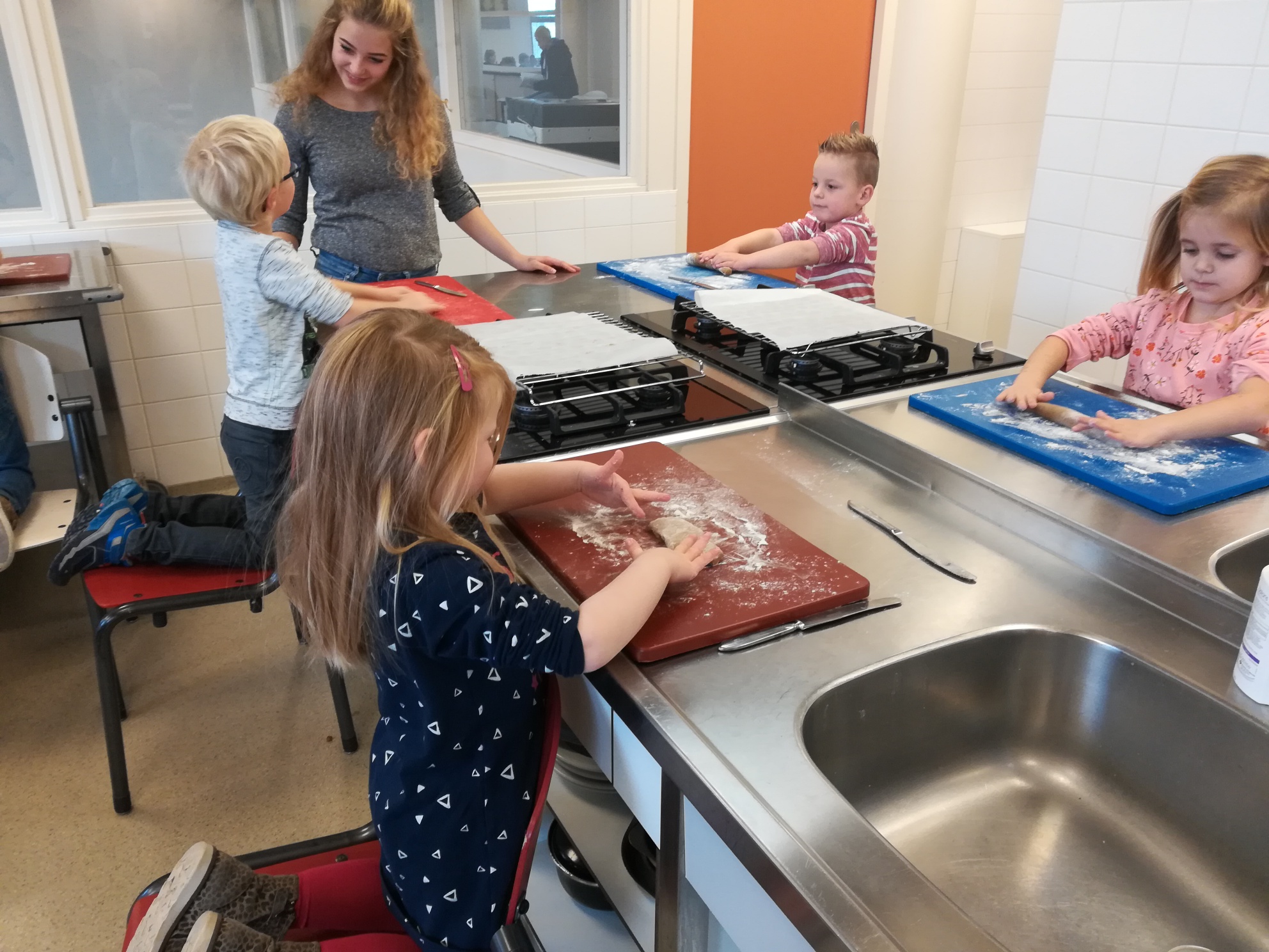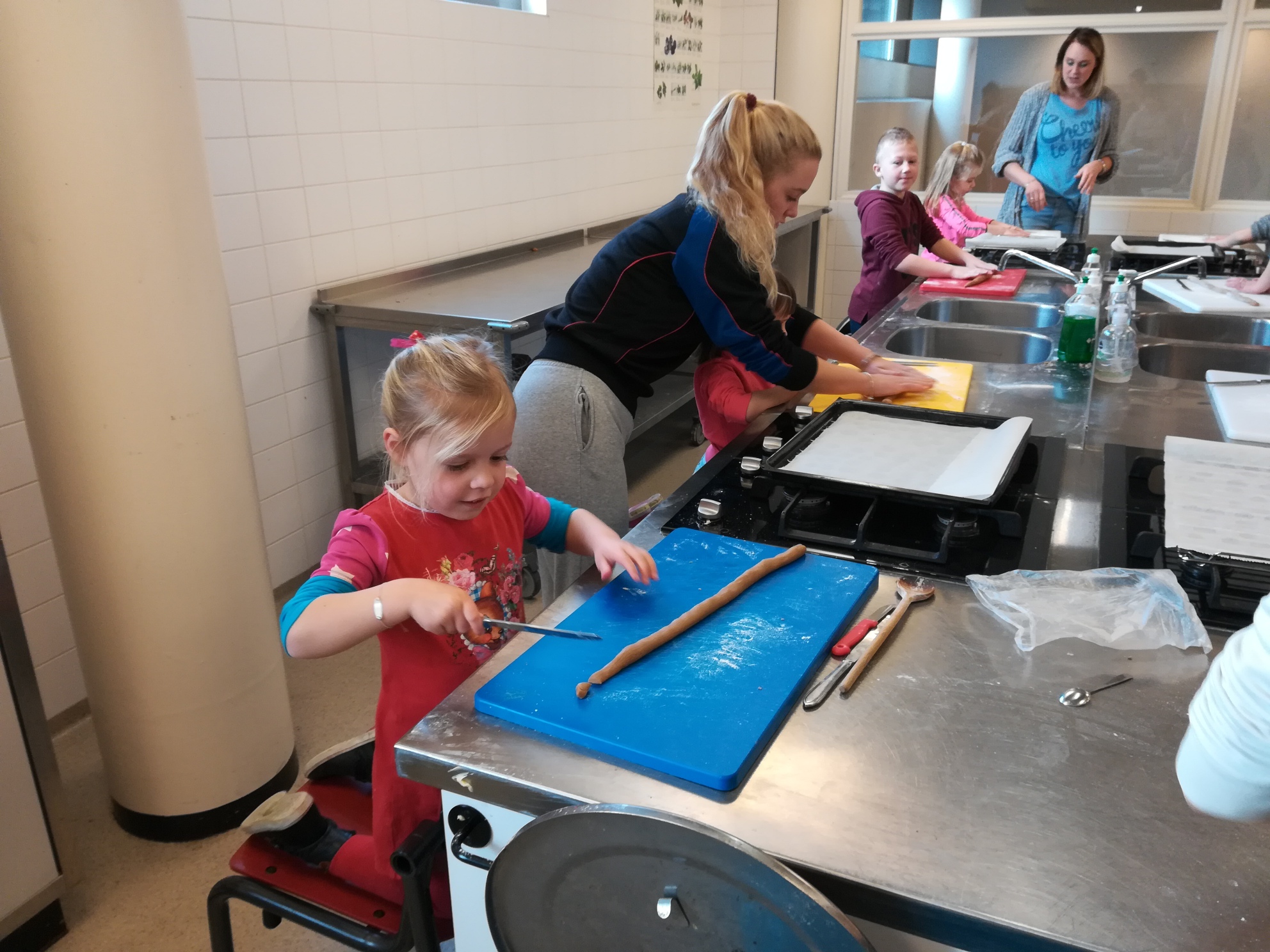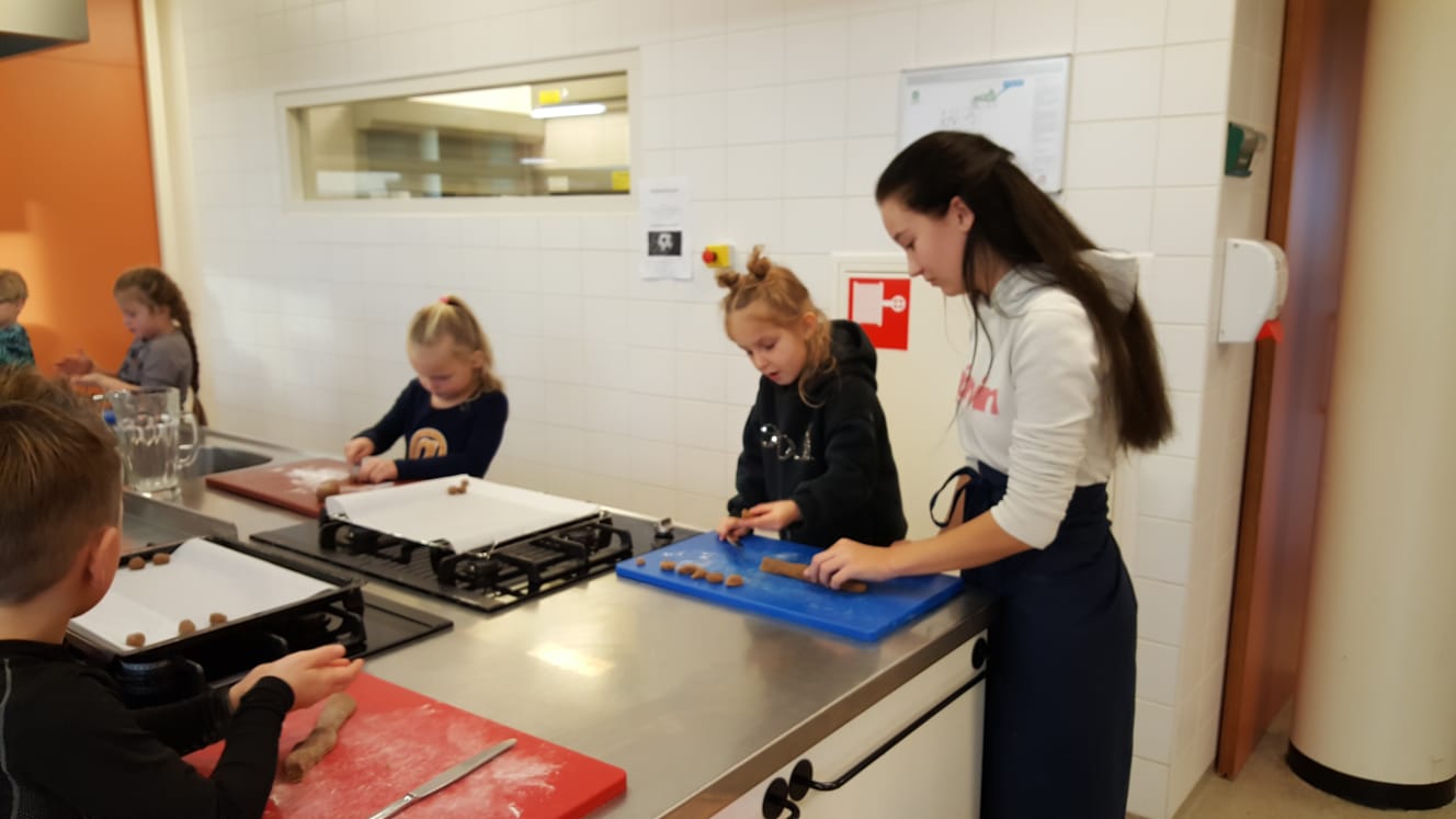 Vandaag op vijf december gingen van basisschool de Opslach in Franeker twee kleutergroepen pepernoten bakken bij de buurschool de Simon Vestdijk. Onder begeleiding van leerlingen van zorg en welzijn van het vierde jaar mochten de kleuters zelf pepernoten snijden en kneden. De leerlingen van de Simon Vestdijk zorgden voor de voorbereidingen het begeleiden en afbakken.
