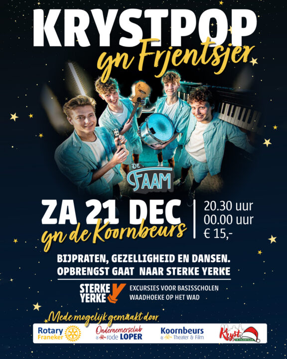 Op zaterdag 21 december vindt Krystpop plaats in Theater de Koornbeurs in Franeker. Een avond vol muziek en gezelligheid, waarbij de opbrengst gaat naar een goed doel. De avond wordt georganiseerd door Rotary Franeker, Kryst yn Frjentsjer, businessclub De Rode Loper en Theater de Koornbeurs.