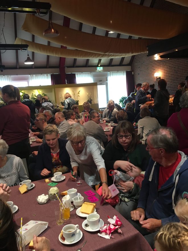 Bij de tweede foto: Gerda Honkoop heeft het druk met verkoop van loten voor het draaiend rad, de 3 generaties aan de tafel kijken toe. Eerste foto is een overzicht