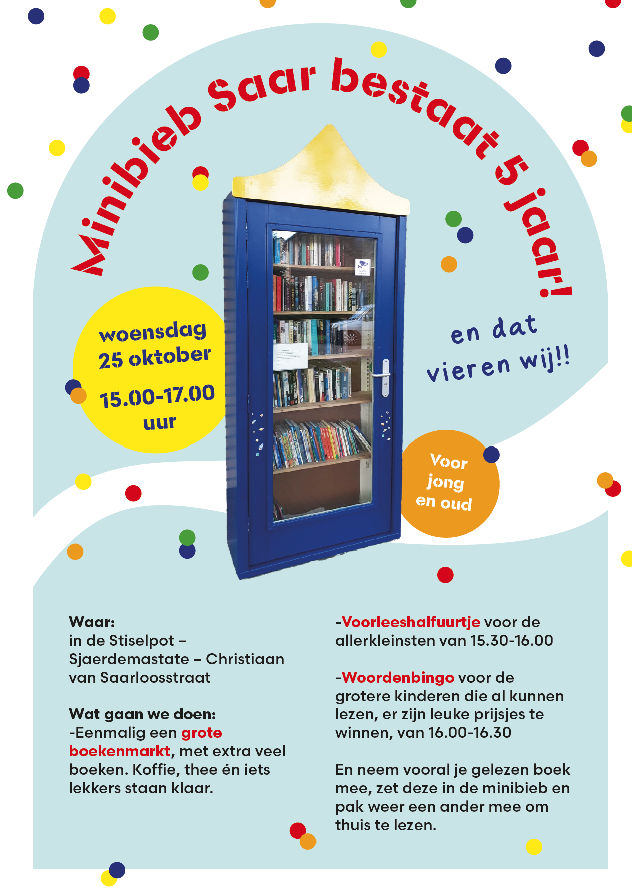 De minibieb Saar in “it Stiselplak” bestaat alweer 5 jaar en is een groot succes in deze wijk en trekt zelfs bezoekers van buiten “it Stiselplak”. Ze vieren het 5-jarig bestaan op 25 oktober met een boekenmarkt, een voorleesactiviteit en een woordenbingo. Deze activiteiten vinden plaats in het buurthuis “Stiselpot”.