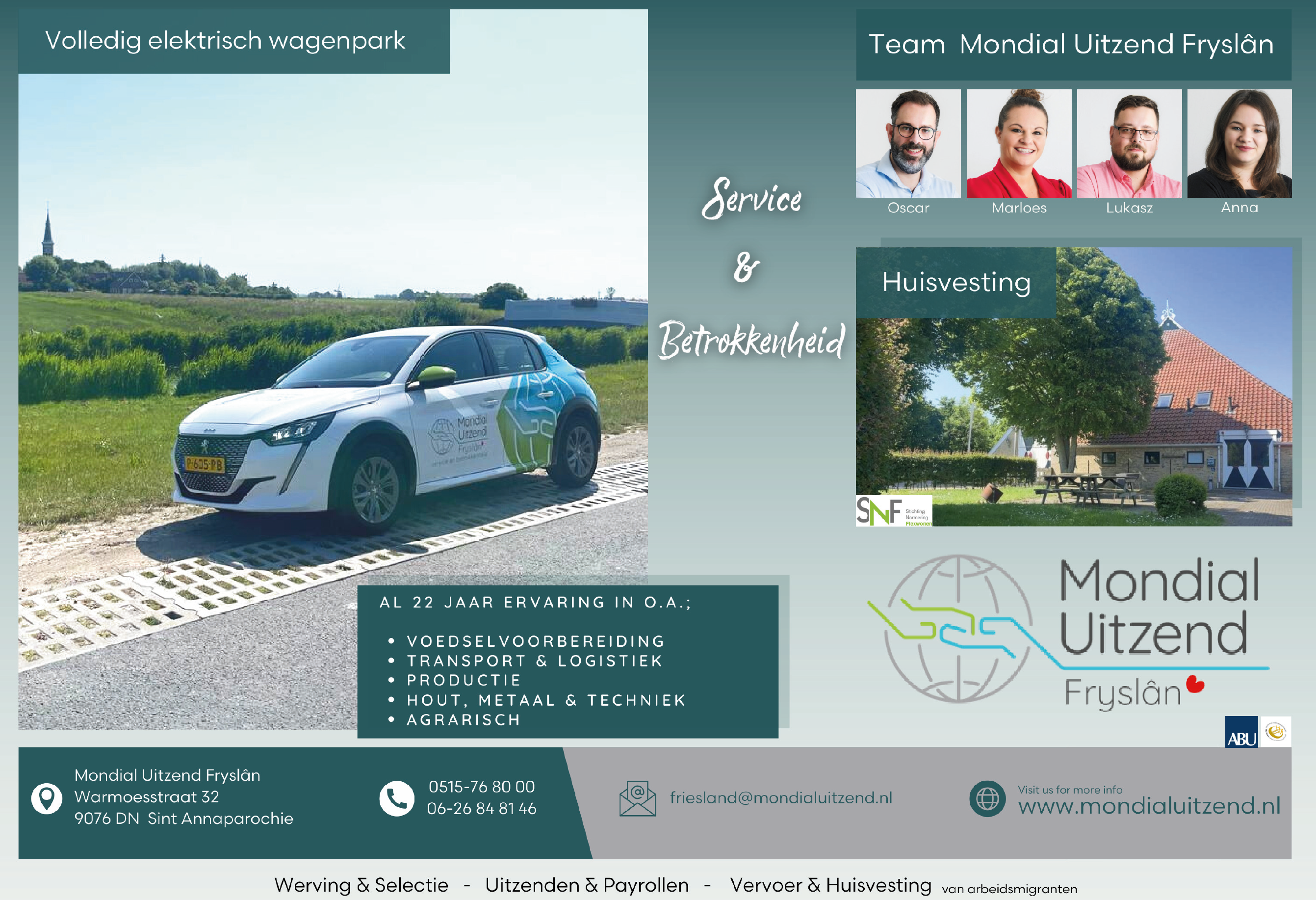 De nieuwe vestiging voorziet sinds begin 2023 ook opdrachtgevers in Friesland en Groningen van gemotiveerde, met zorg geselecteerde uitzendkrachten. Wel onder een aangepaste naam; Mondial Uitzend Fryslân. Inmiddels is het team in Friesland uitgebreid met nog eens 2 ervaren collega’s, Lukasz en Anna Miera, die op hun beurt met het gezin verhuisd zijn naar Tzummarum.