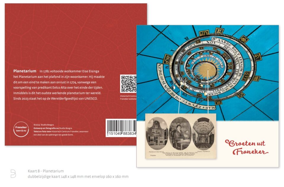 De achtste foto is van het Planetarium, gekozen vanwege hun vorig jaar verkregen Werelderfgoedstatus. De kaarten zijn te koop bij het HCF (historisch Centrum Franeker) en bij Primera aan de Voorstraat. De prijs is € 2,99 per stuk, inclusief envelop.