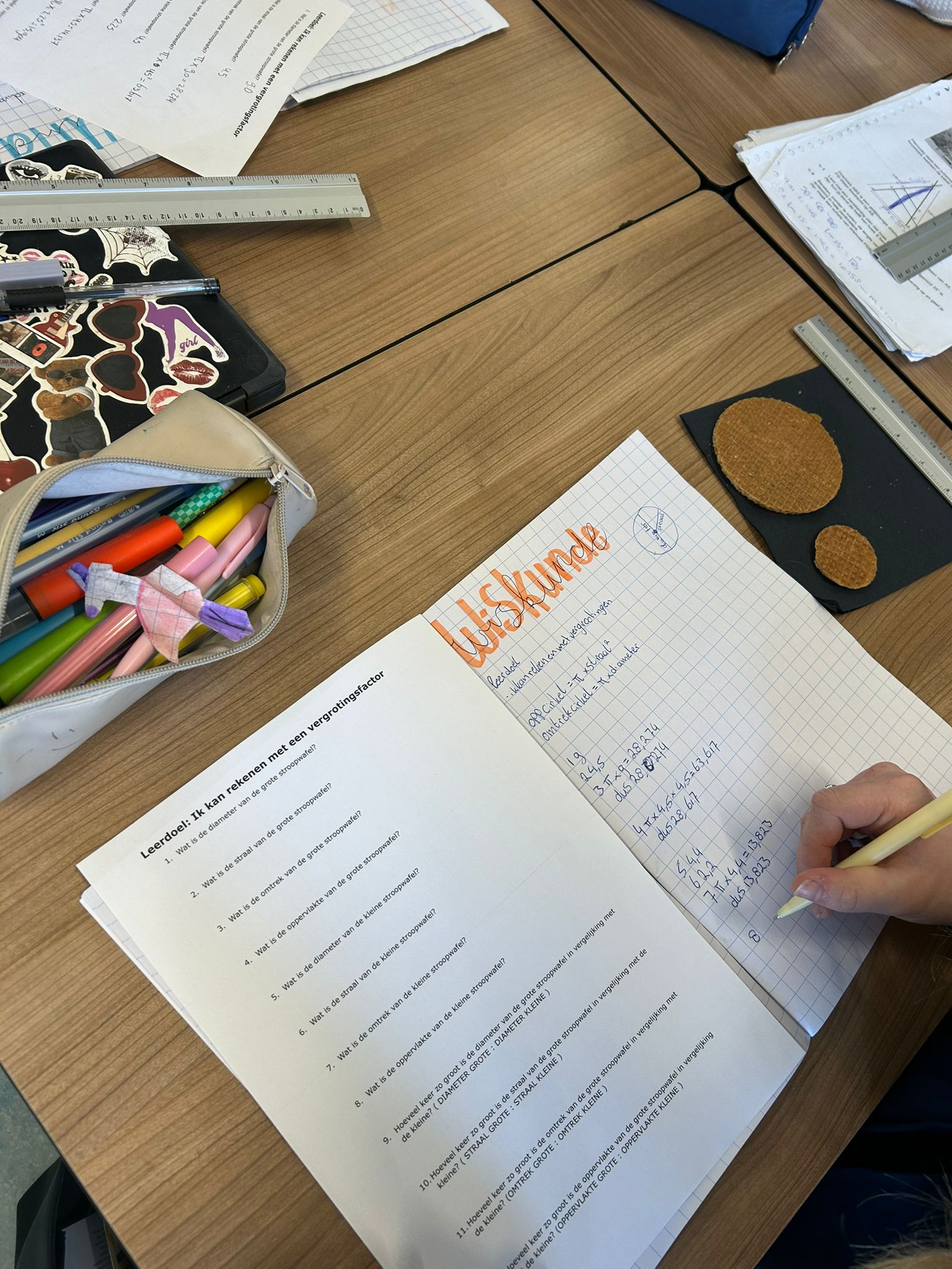 Bij wiskunde heeft klas 4 gerekend met vergrotingen en vergrotingsfactor. Rekenen met vergrotingsfactor betekent dat je een figuur groter of kleiner maakt door alle lengtes met dezelfde factor te vermenigvuldigen (of te delen). En wat is er nou leuker dan daarvoor mini- en grote stroopwafels te gebruiken.