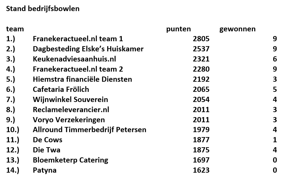 Alle teams hebben na de 3e speelronde negen wedstrijden gespeeld en de teams van Franekeractueel 1 en 2 en het team van Dagbesteding Elske’s Huiskamer hebben al hun wedstrijden nog gewonnen. Daar zal de volgende speelronde verandering in gaan komen aangezien de teams dan in een onderlinge strijd gaan uitkomen.