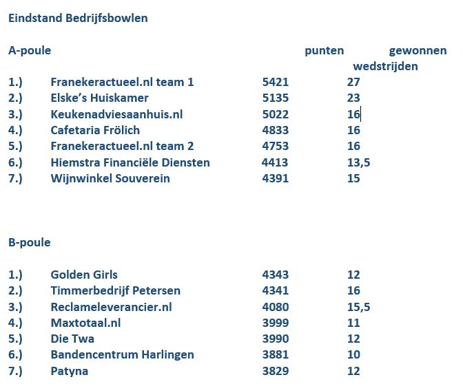 Na 9 speelrondes heeft het team van Franekeractueel.nl 1 de titel van het bedrijfsbowlen in de wacht gesleept. De bowlers van dit team Eddie Spoelstra, Geert Kuiken en invaller Douwe “de overloper” Talhout hebben het gehele seizoen bovenaan gestaan en wonnen 27 van hun 31 gespeelde wedstrijden en wisten een gemiddelde teamscore van ruim 301 punten per wedstrijd bijeen te bowlen. Als tweede eindigde het team van Dagbesteding Elske’s Huiskamer en als derde eindigde het team van Keukenadviesaanhuis.nl In de B –poule leek voor aanvang van de laatste speelronde de 1e plaats het team van Allroundtimmerbedrijf Petersen niet meer te kunnen ontgaan. Maar mede door een hele slechte wedstrijd en het goed presteren van de dames van de “Golden Girls” wonnen deze uiteindelijk door over het gehele seizoen 2 kegels meer omgegooid te hebben. Derde In deze poule werd het team van de Reclameleverancier.nl.