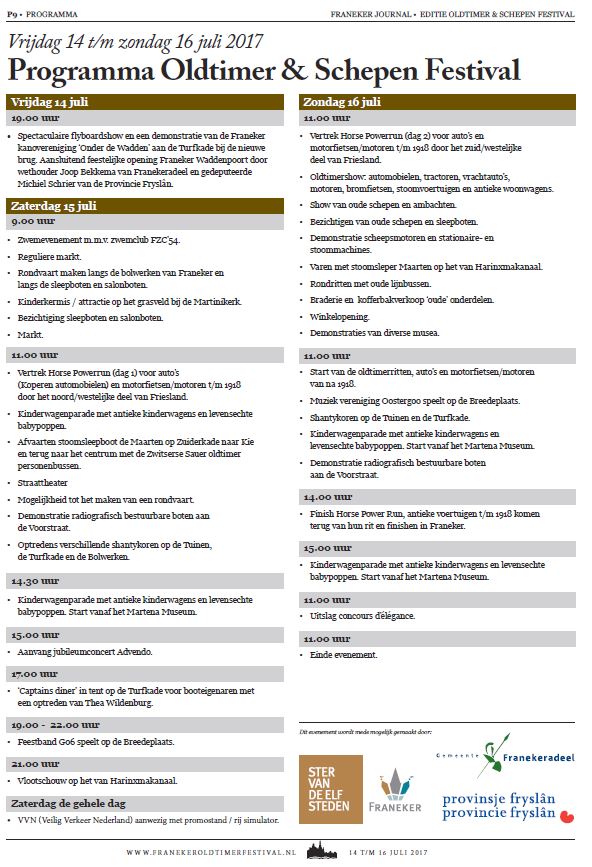 De gehele binnenstad is tijdens deze dagen één groot evenementencentrum. Het feest kent vele hoogtepunten, zoals o.a. diverse optredens, een open water zwemevenement m.m.v. de Franeker Zwemclub, een onderdelenmarkt voor oldtimers (kofferbakverkoop) en nog véél meer.