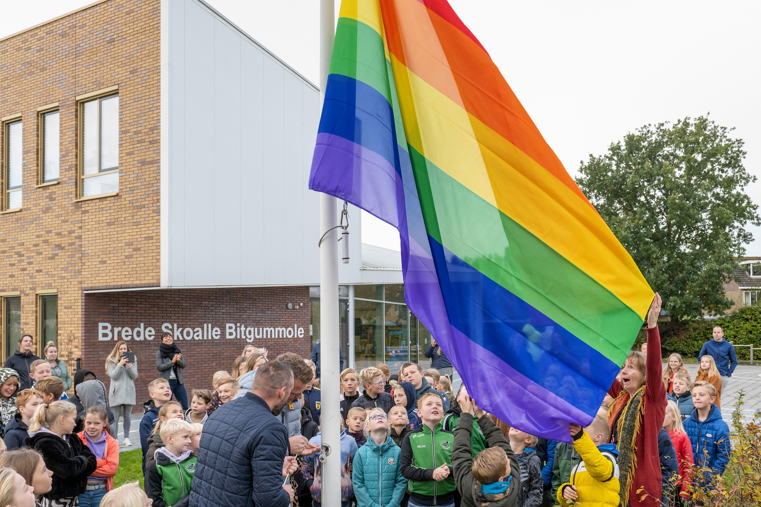 De gemeente vindt het belangrijk dat kinderen van jongs af aan weten dat Waadhoeke een gemeente wil zijn waarin iedereen erbij hoort en gelijkwaardig is. Daarom waren naast de dorpen ook de scholen van harte uitgenodigd om de regenboogvlag te hijsen. Er kwamen vele reacties binnen, van meer dan de helft van de dorpen. CBO Noardwest Fryslân bestelde voor al haar scholen een regenboogvlag en ook het merendeel van de andere scholen bestelde een vlag of liet weten er al een te hebben. Vandaag wappert de regenboogvlag dus op tal van plaatsen in Waadhoeke.