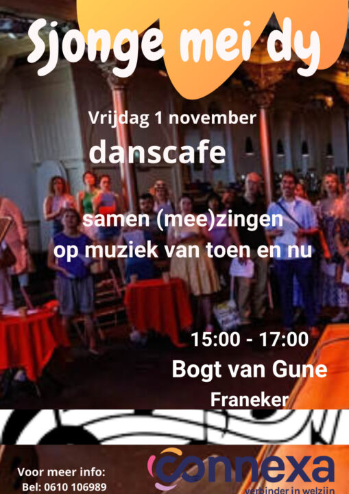 Het danscafé is op vrijdagmiddag 1 november van 15 – 17 uur in de Bogt fen Gune. Verder info via 06 10106989.