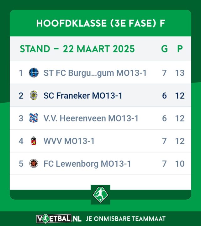 Trainer Peter was zeer tevreden over de teamprestatie. “Dit was echt een overwinning van het hele team”, aldus de trainer. Door het puntenverlies van de concurrentie staat SC Franeker MO13-1 nu op de tweede plaats, met nog een wedstrijd tegoed.