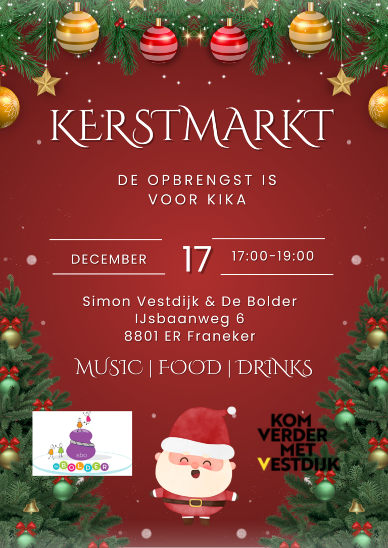Op woensdag 17 december organiseert klas F3BK samen met het team van RSG Simon Vestdijk een sfeervolle kerstmarkt op de school in Franeker. Wij nodigen iedereen van harte uit om langs te komen en te genieten van warme kerstsfeer, gezellige muziek en heerlijke lekkernijen.