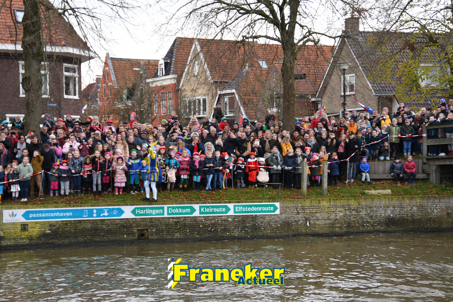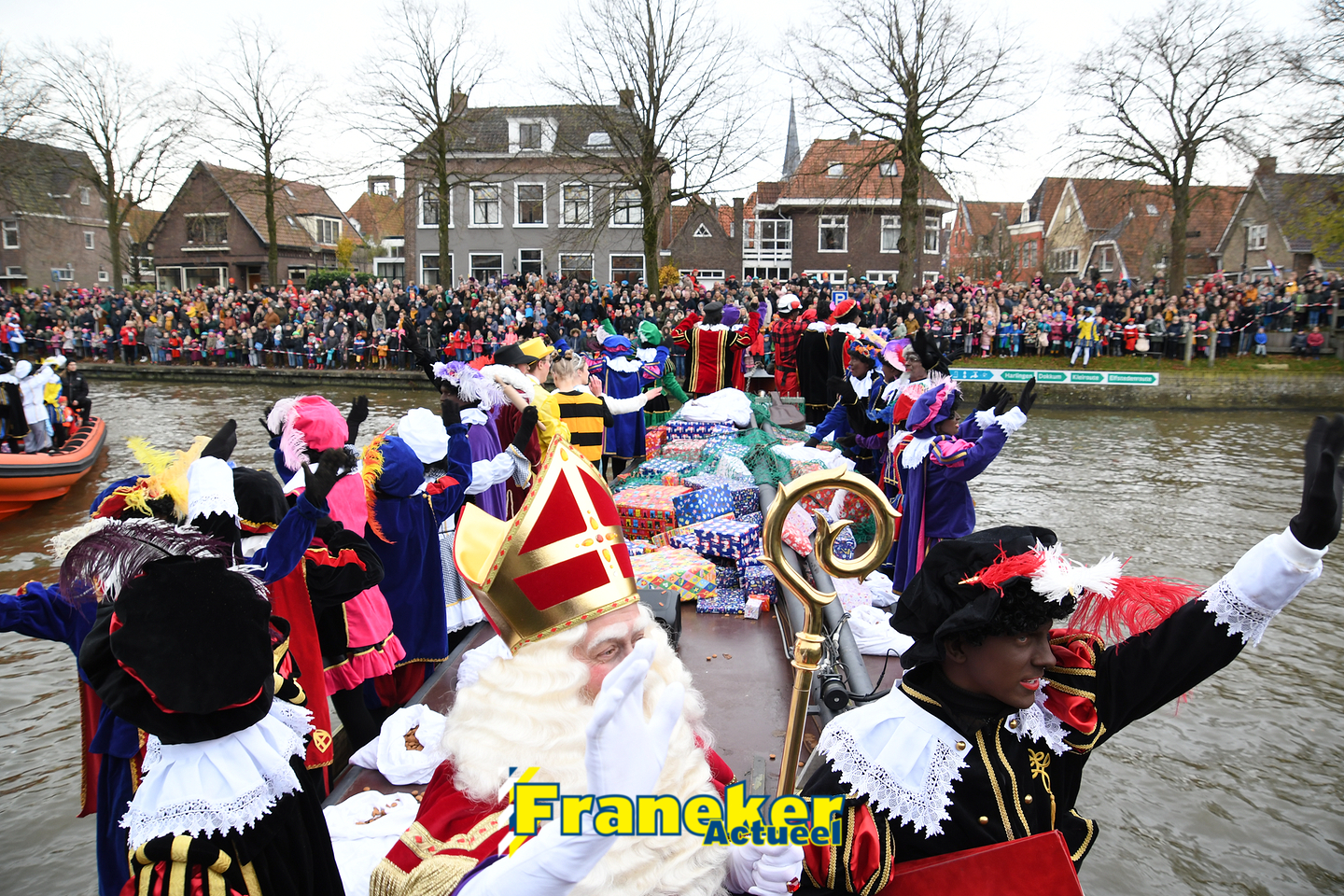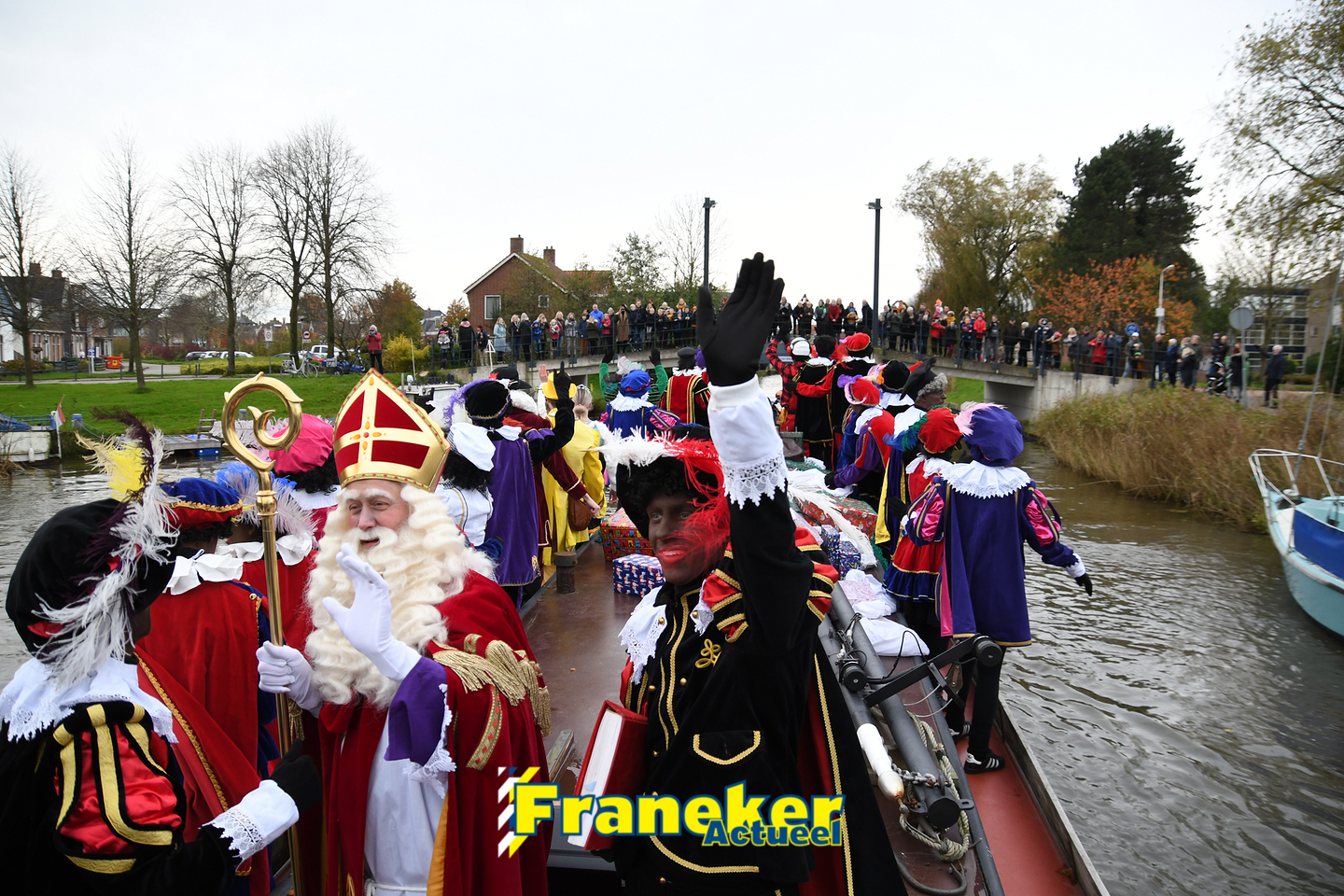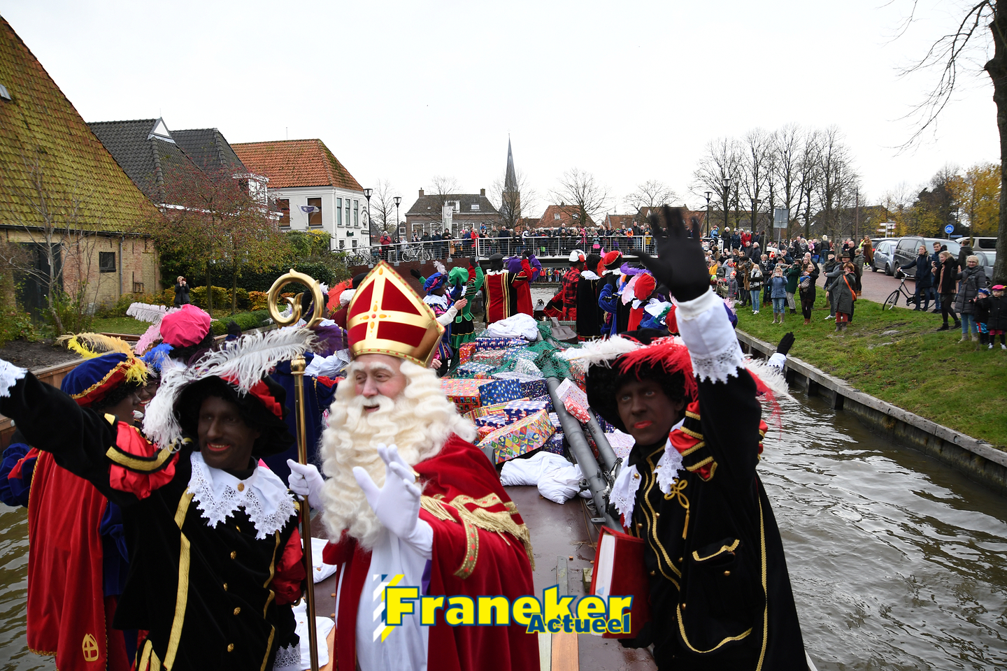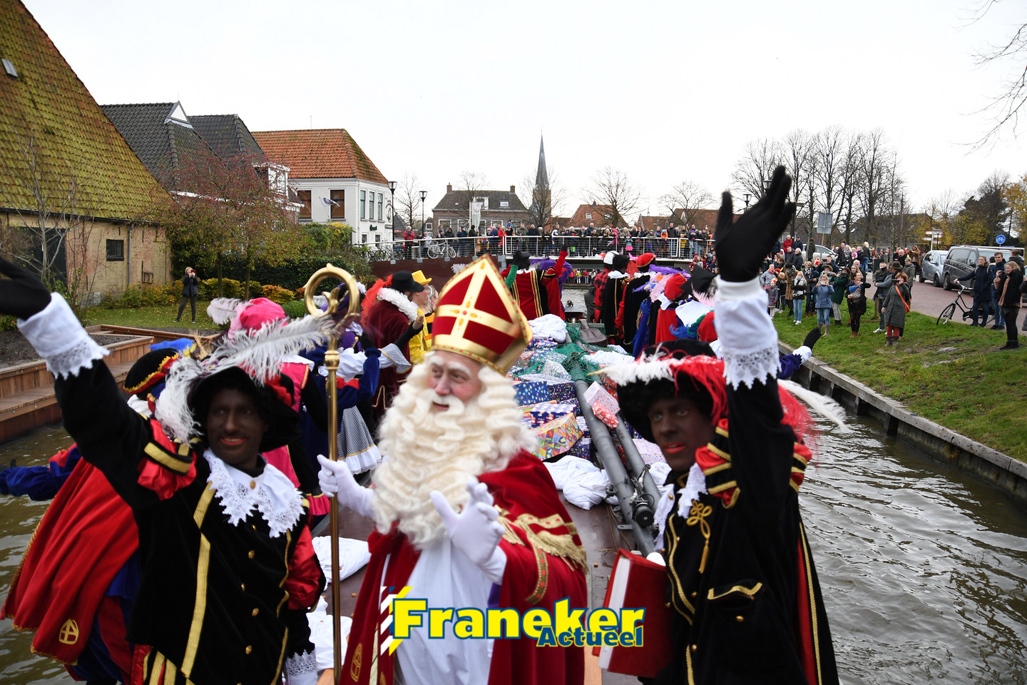 Sinterklaas is weer veilig in Franeker aangekomen. Met een warm welkom werd Sinterklaas en zijn zwarte pieten van de boot gehaald en door vele, vele toeschouwers luid toezongen.