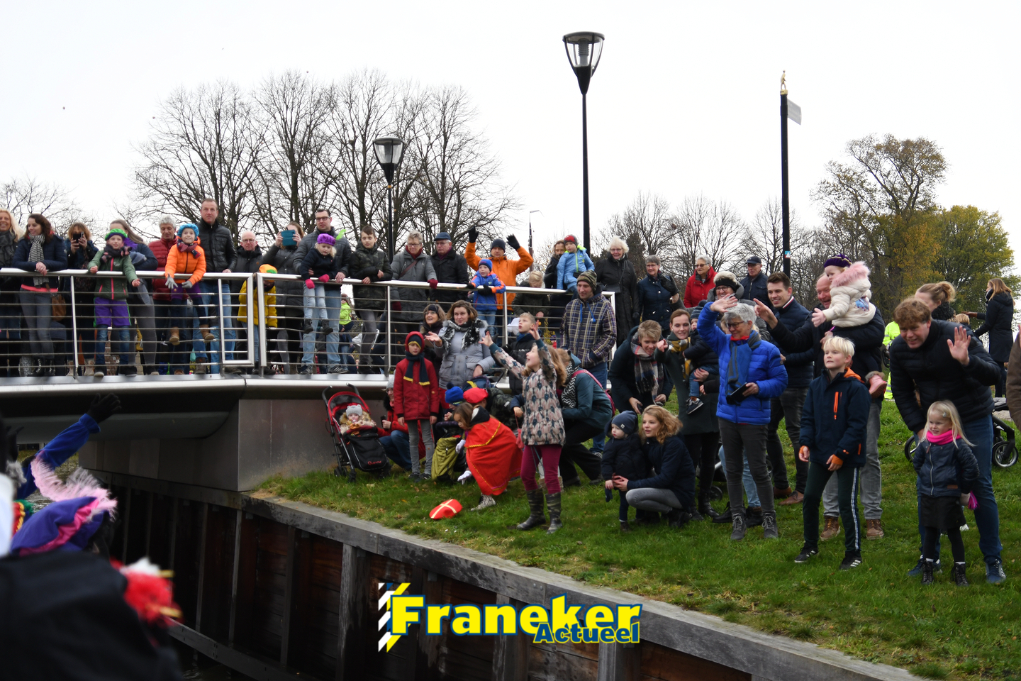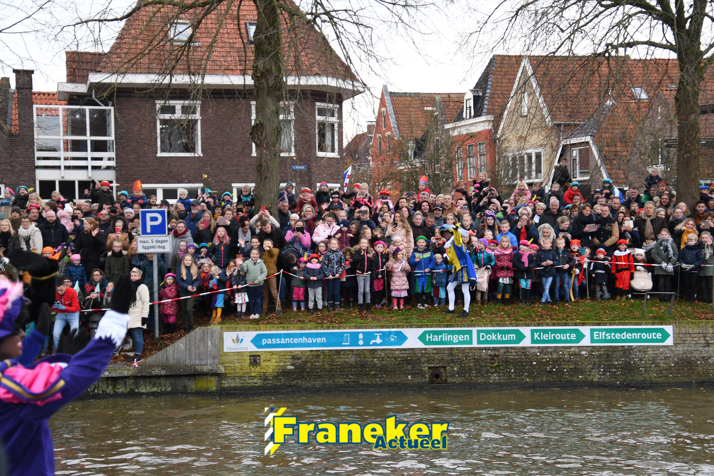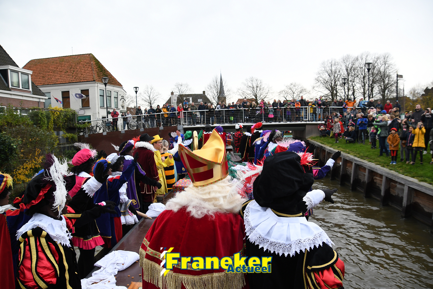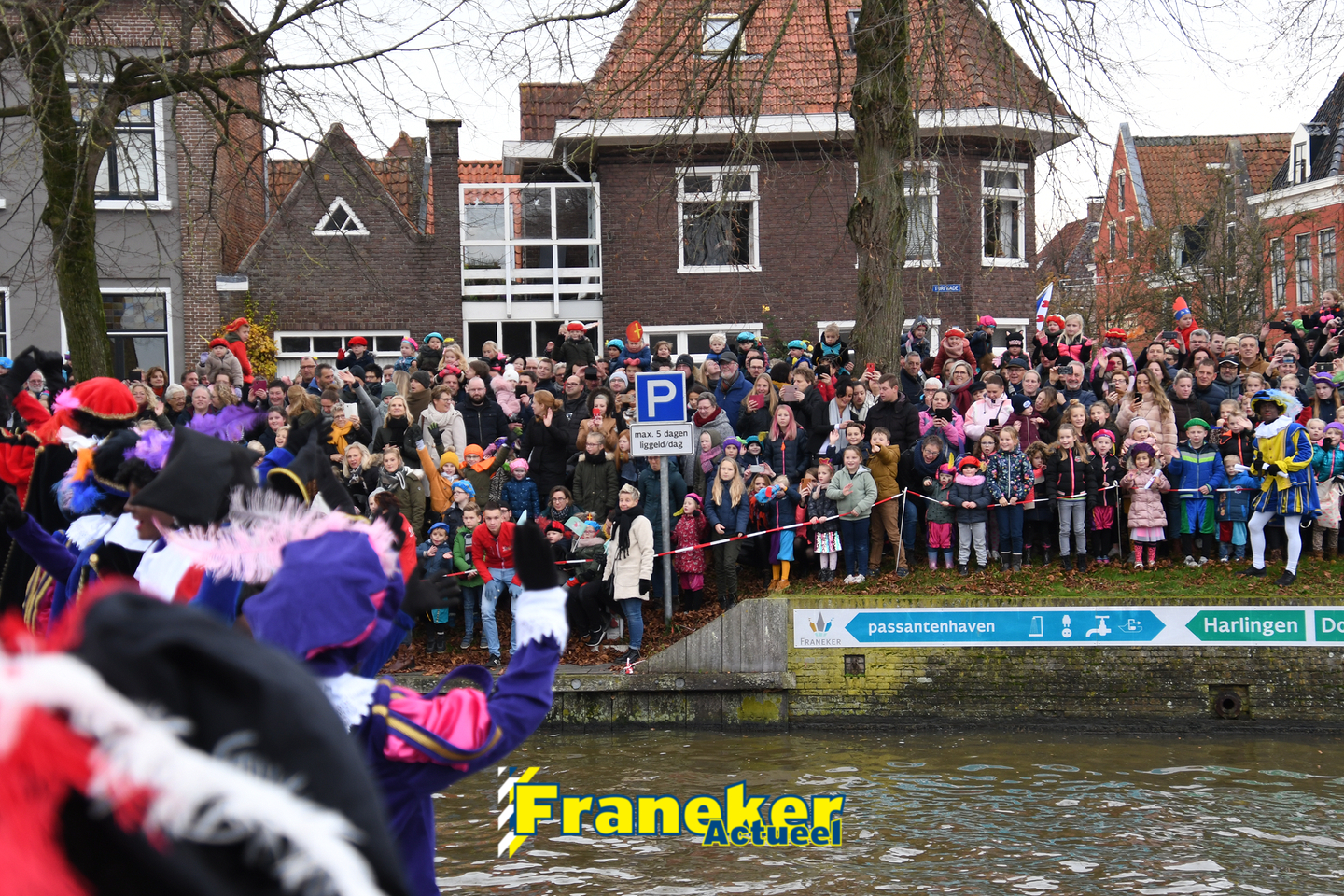 Sinterklaas is weer veilig in Franeker aangekomen. Met een warm welkom werd Sinterklaas en zijn zwarte pieten van de boot gehaald en door vele, vele toeschouwers luid toezongen.