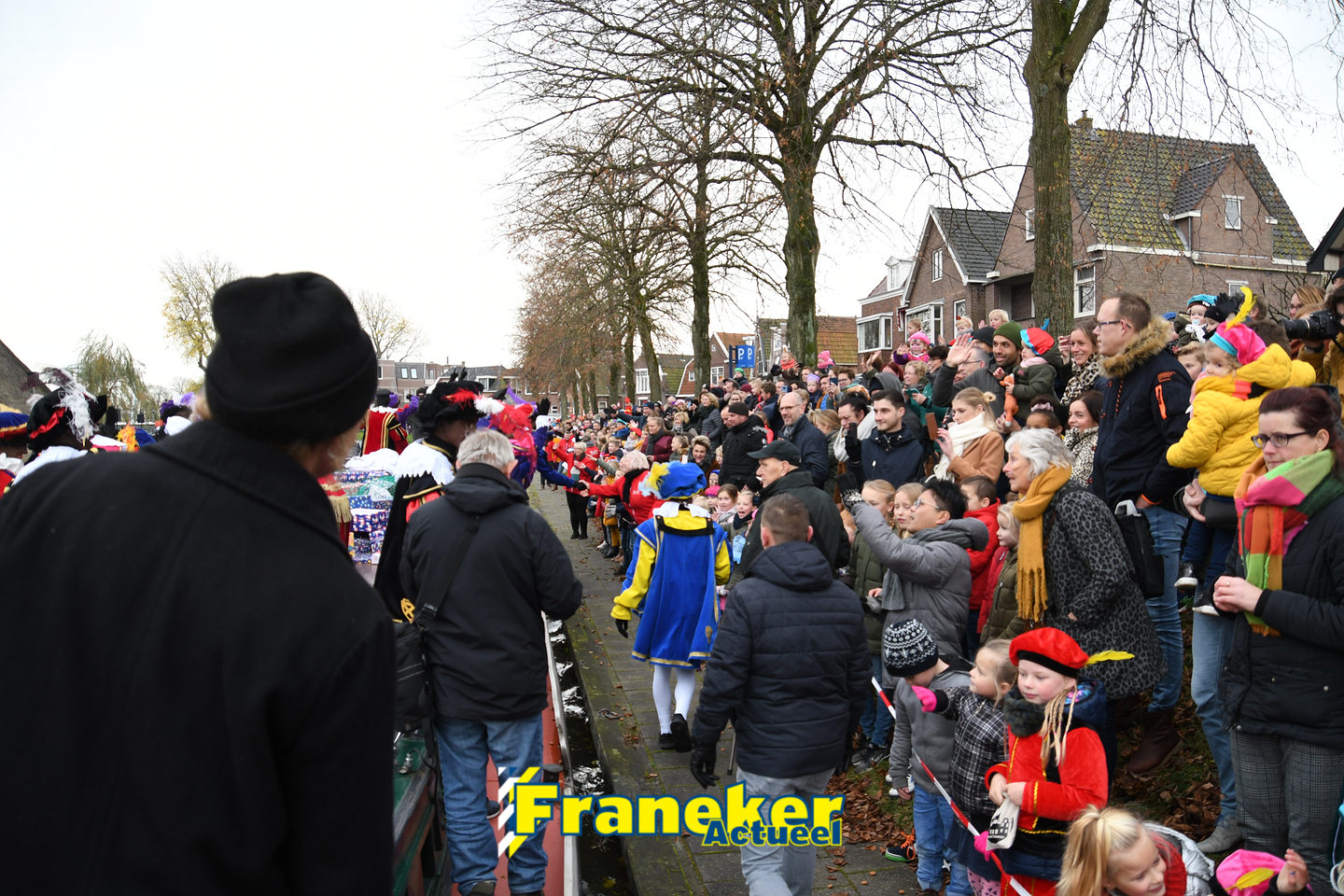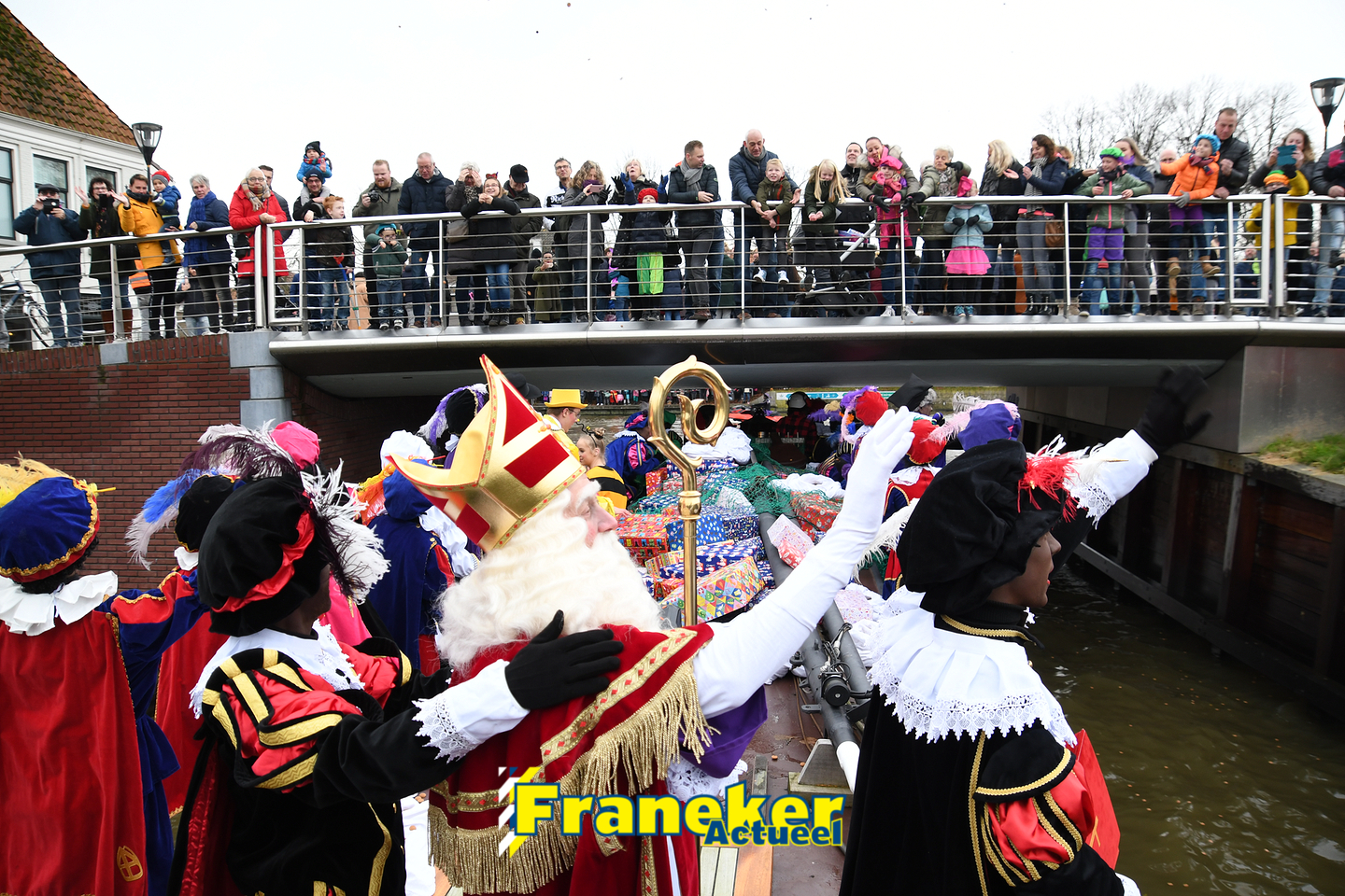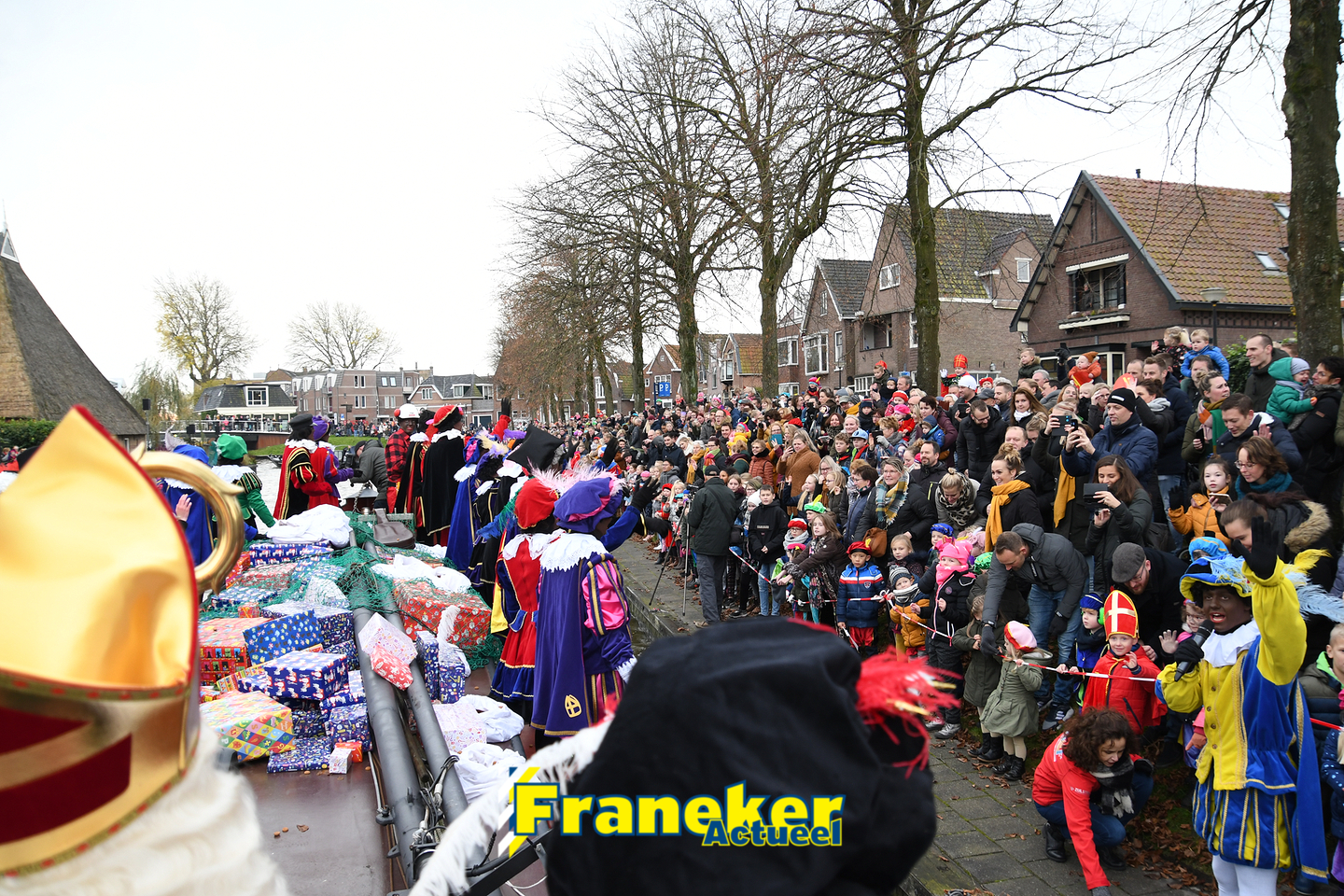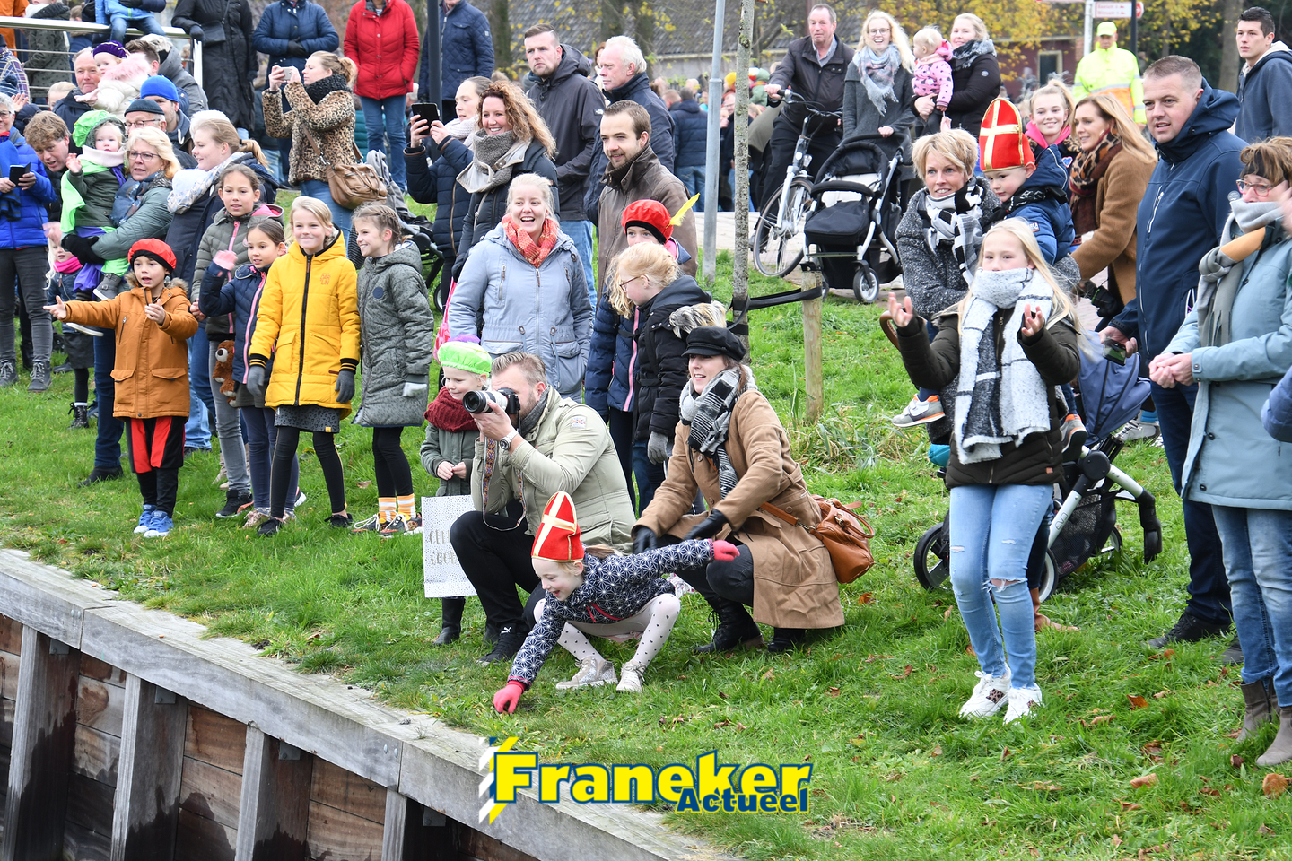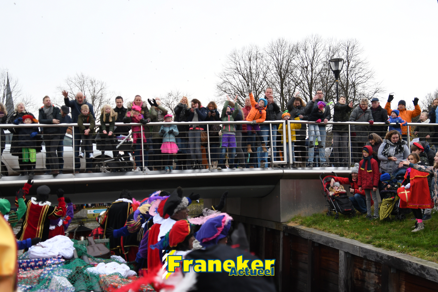 Sinterklaas is weer veilig in Franeker aangekomen. Met een warm welkom werd Sinterklaas en zijn zwarte pieten van de boot gehaald en door vele, vele toeschouwers luid toezongen.