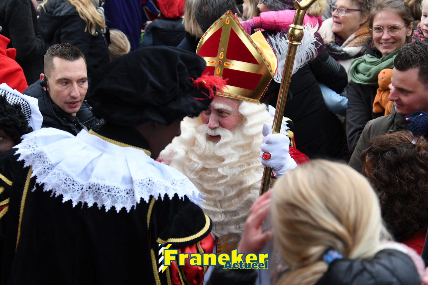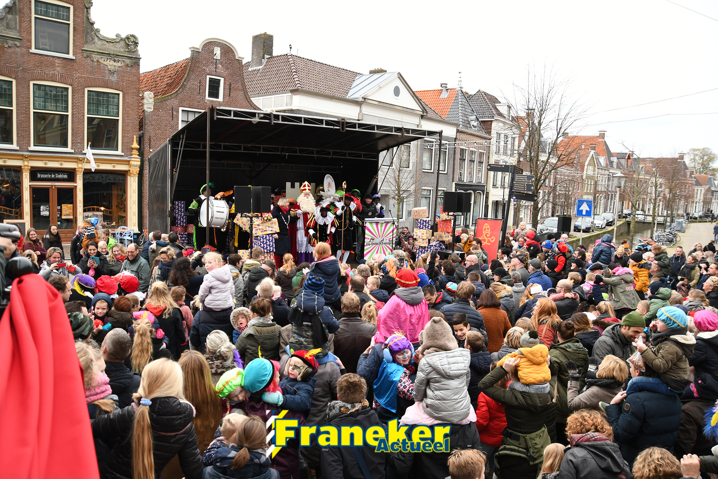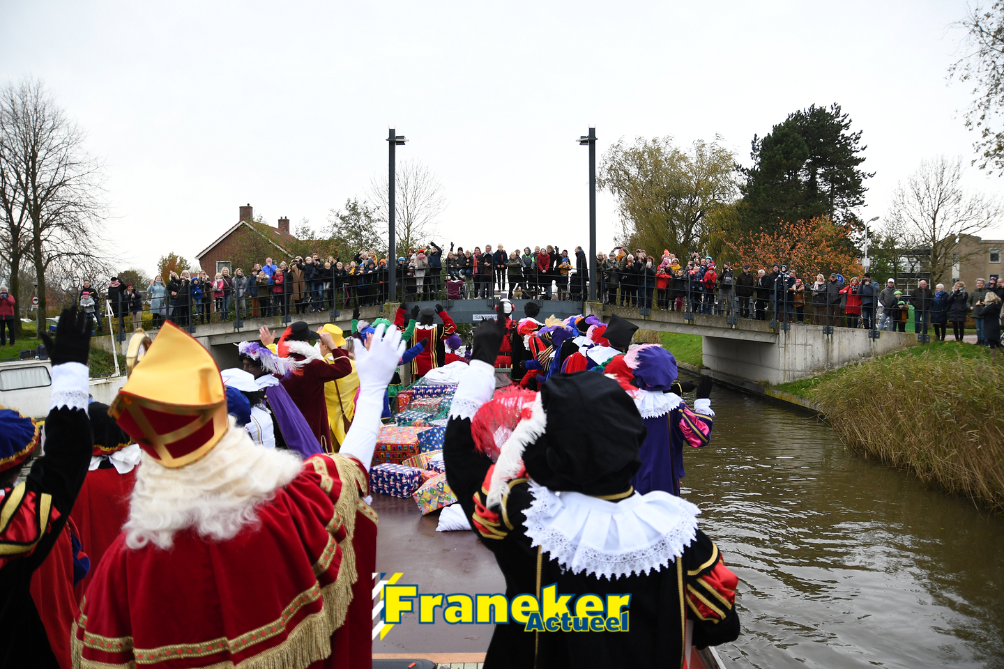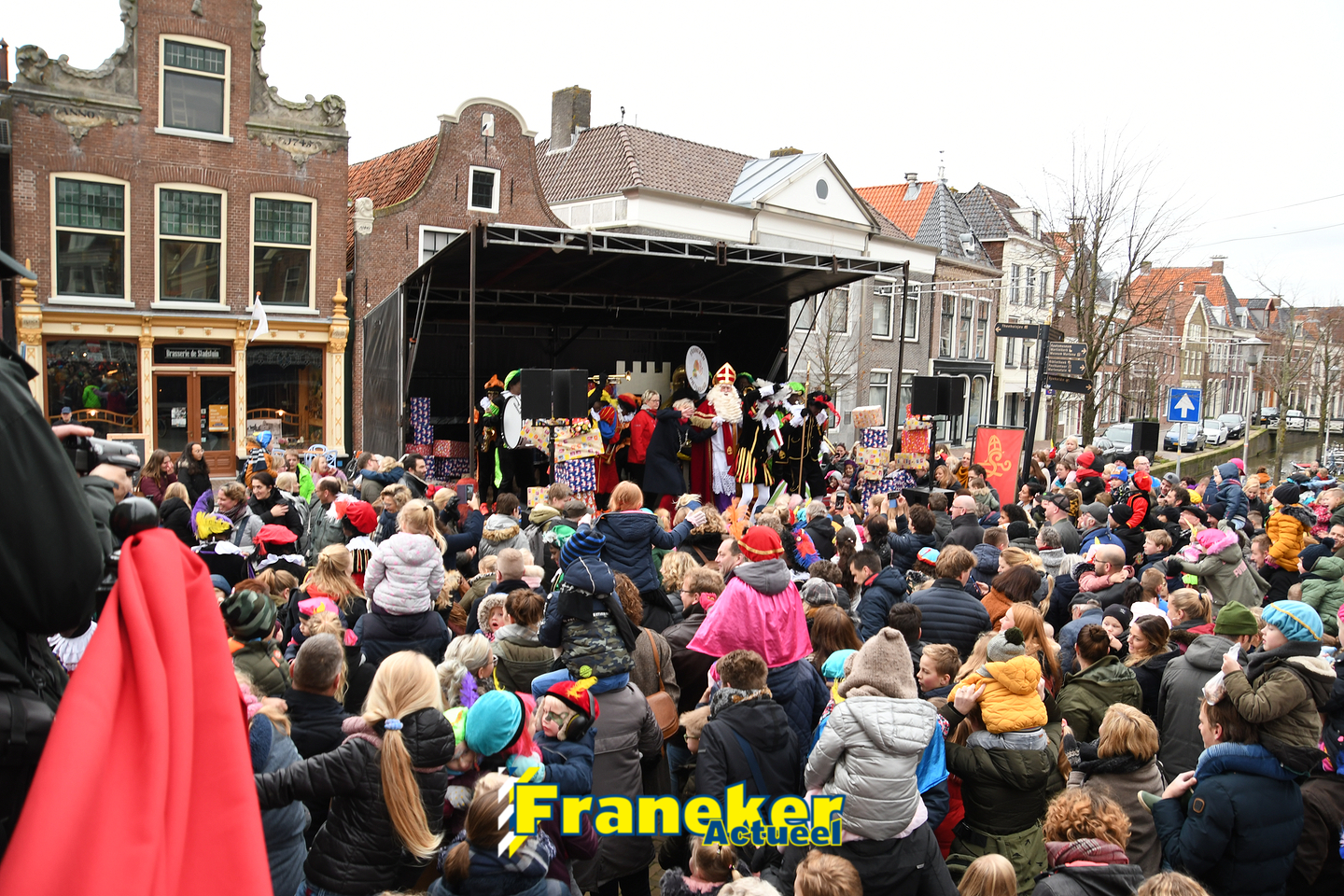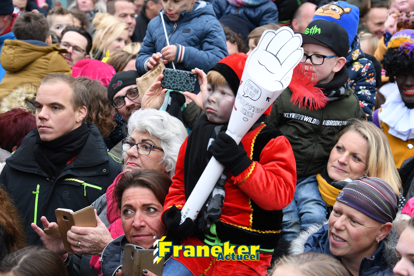 Sinterklaas is weer veilig in Franeker aangekomen. Met een warm welkom werd Sinterklaas en zijn zwarte pieten van de boot gehaald en door vele, vele toeschouwers luid toezongen.